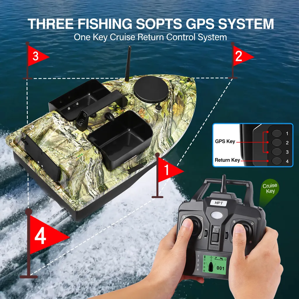 Hey Angelfreunde! Stellt euch vor: Ihr sitzt gemütlich am See und steuert euer Köderboot per Fernbedienung genau dorthin, wo die dicken Karpfen stehen. Mit diesem cleveren GPS-Boot wird Angeln zum High-Tech-Erlebnis! \n\nDas Besondere: Vier unabhängige Futtertrichter, die ihr einzeln ansteuern könnt - so lockt ihr die Fische gezielt an. Die Dual-Antenne sorgt für stabiles Signal bis 500 Meter, und das eingebaute Gyro hält den Kurs auch bei Wellengang. \n\nPraktisch: Die doppelten Stromkabel nehmen zwei 5200-mAh-Batterien gleichzeitig - damit angelt ihr ewig ohne Sorge um den Akku. Und wenn doch mal der Saft ausgeht, findet das Boot automatisch zurück zum Startpunkt. \n\nMit LED-Beleuchtung für Nachtangeln, leisen Motoren und der praktischen Tragetasche wird dieser Begleiter zum zuverlässigen Partner für jeden Angeltrip. 3kg Köder transportiert das Boot problemlos - damit lockt ihr bestimmt die großen Brummer an!