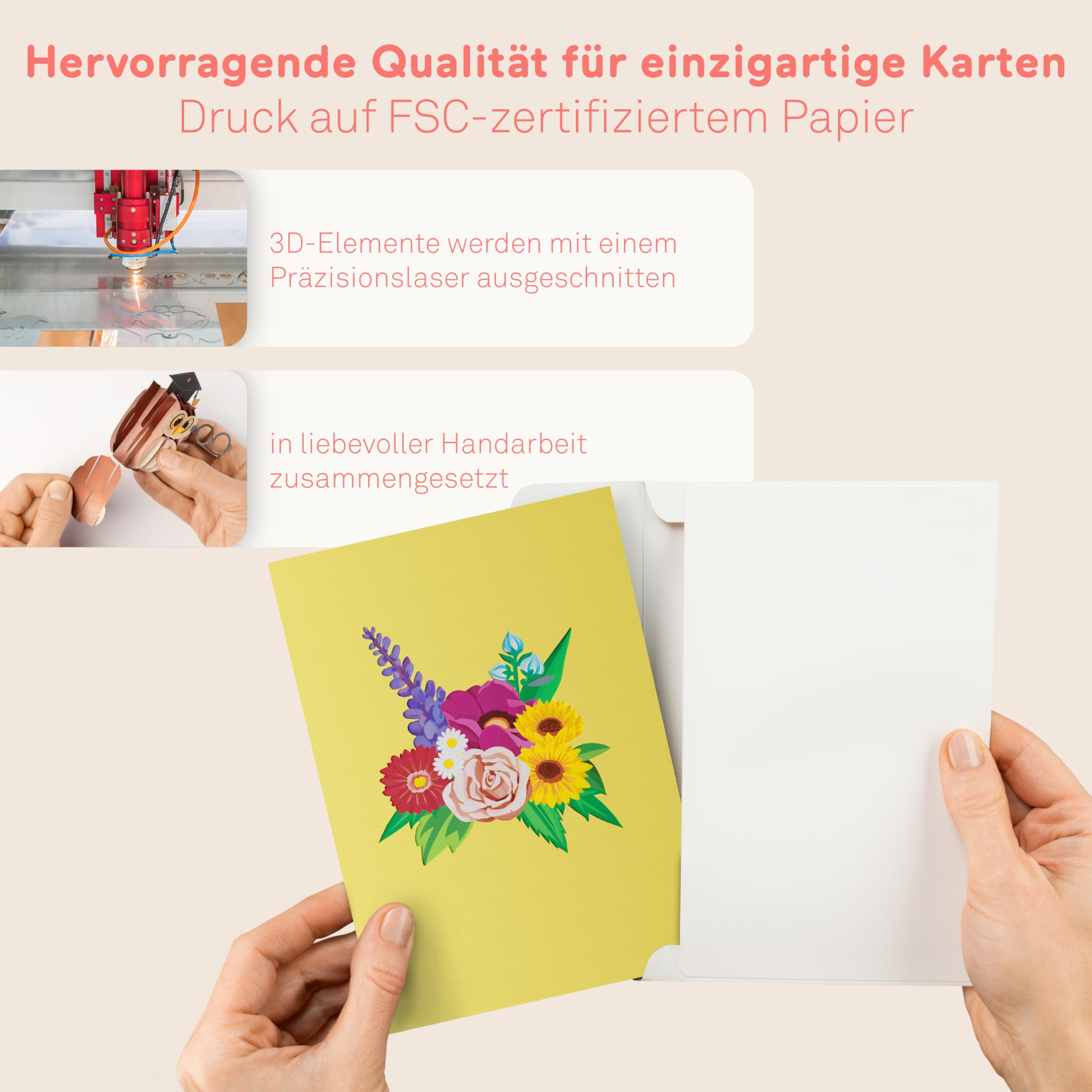 Wow, diese 3D Pop Up Karte wird jeden begeistern! Beim Öffnen entfaltet sich ein wunderschöner Blumenkorb in filigraner Laserarbeit. Perfekt für Geburtstage, Muttertag, Dankeskarten oder Gute Besserung. Mit beschreibbarem Einlegeblatt für deine persönlichen Wünsche. Jede Karte wird in Handarbeit hergestellt - ein richtiges Unikat von einem Kleinunternehmen. Hochwertiges Papier, liebevolle Details. So überreichst du Geldgeschenke oder Gutscheine besonders stylisch. Eine echte Überraschung mit Wow-Effekt für Mama, Oma, Freundin oder Kolleginnen!