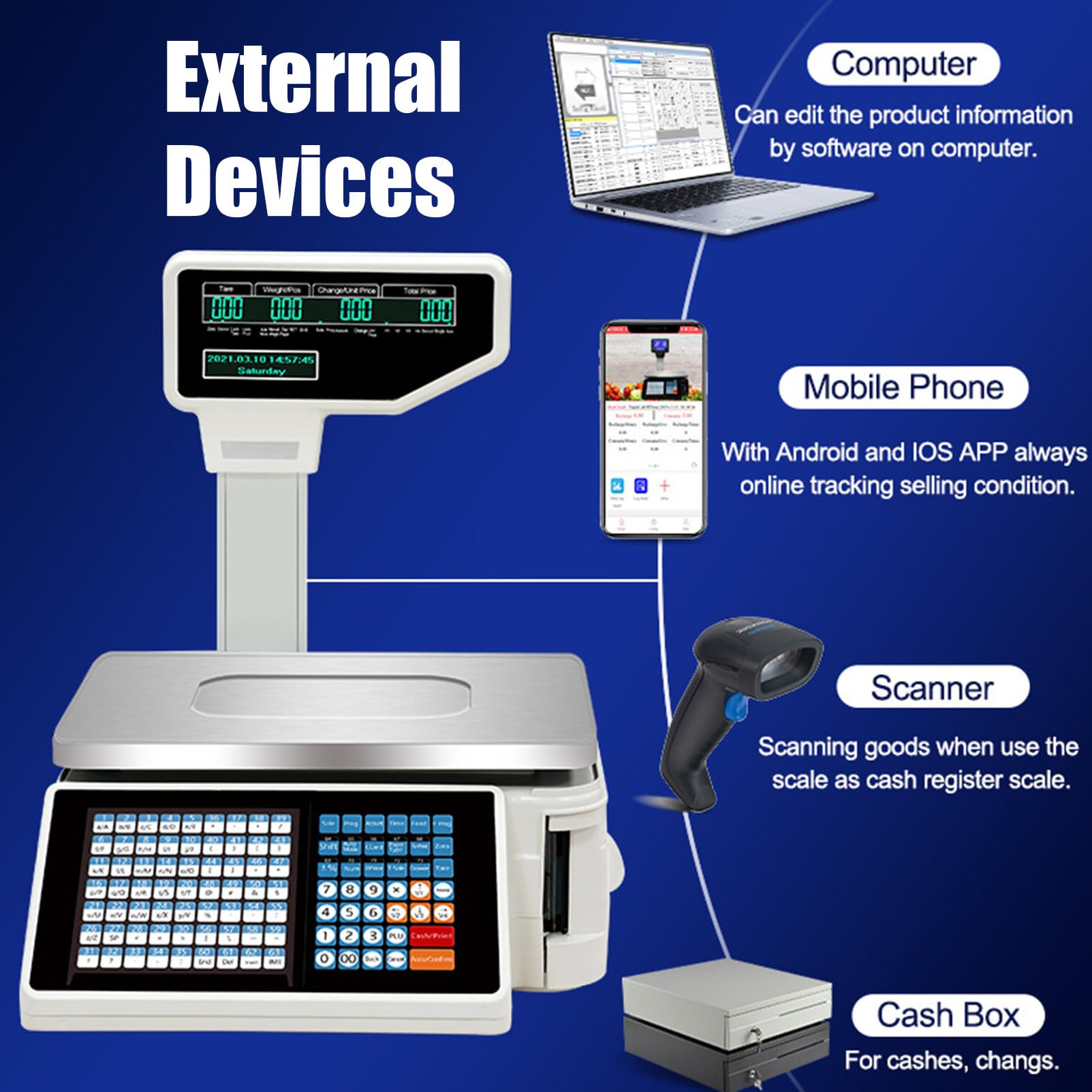 Das Besondere: Sie können die Sprache individuell einstellen und die Waage mit externen Geräten wie Computern oder Scannern verbinden. So erstellen Sie mühelos Produktinformationen und drucken Etiketten mit Namen, Nettopreis, Bruttopreis und Datum.