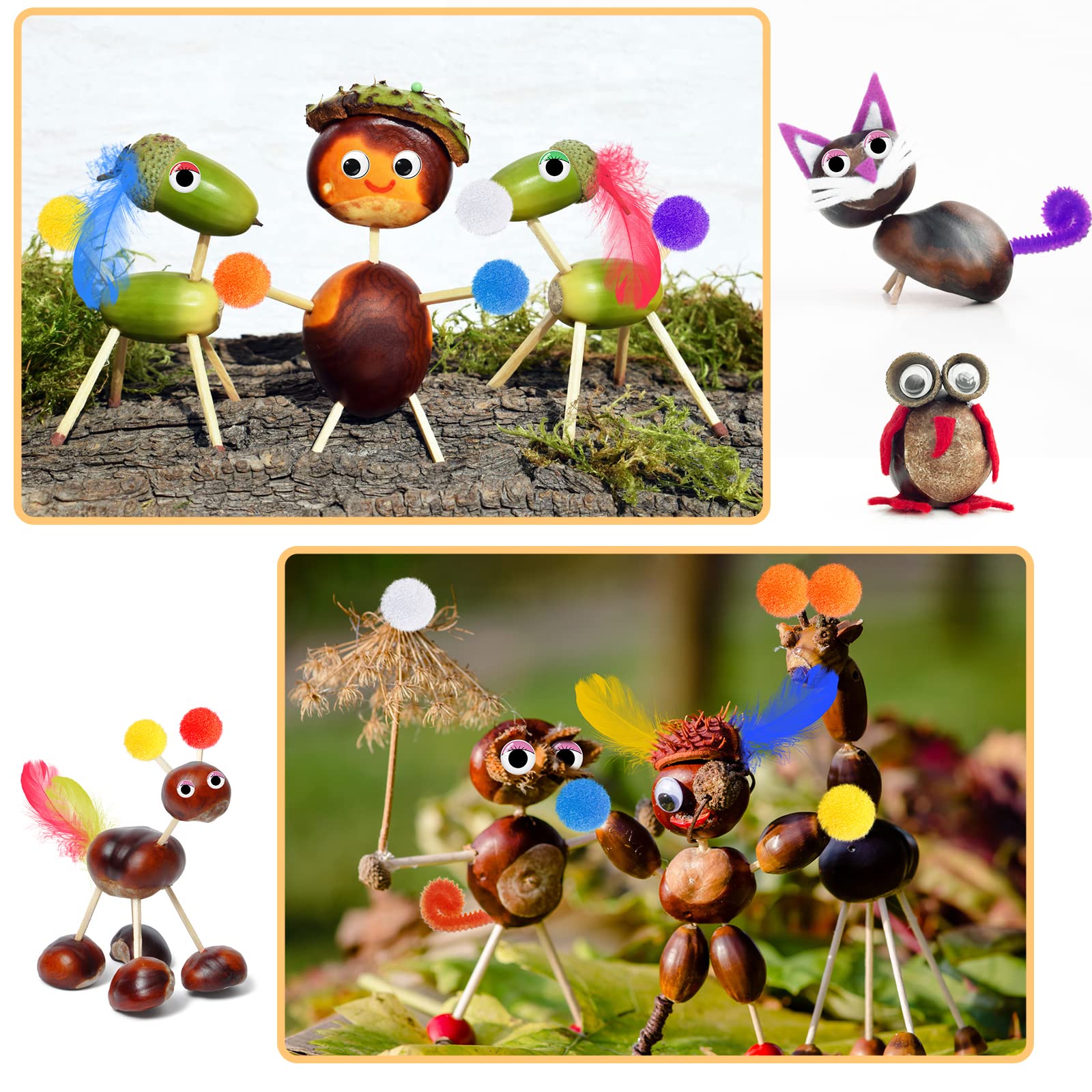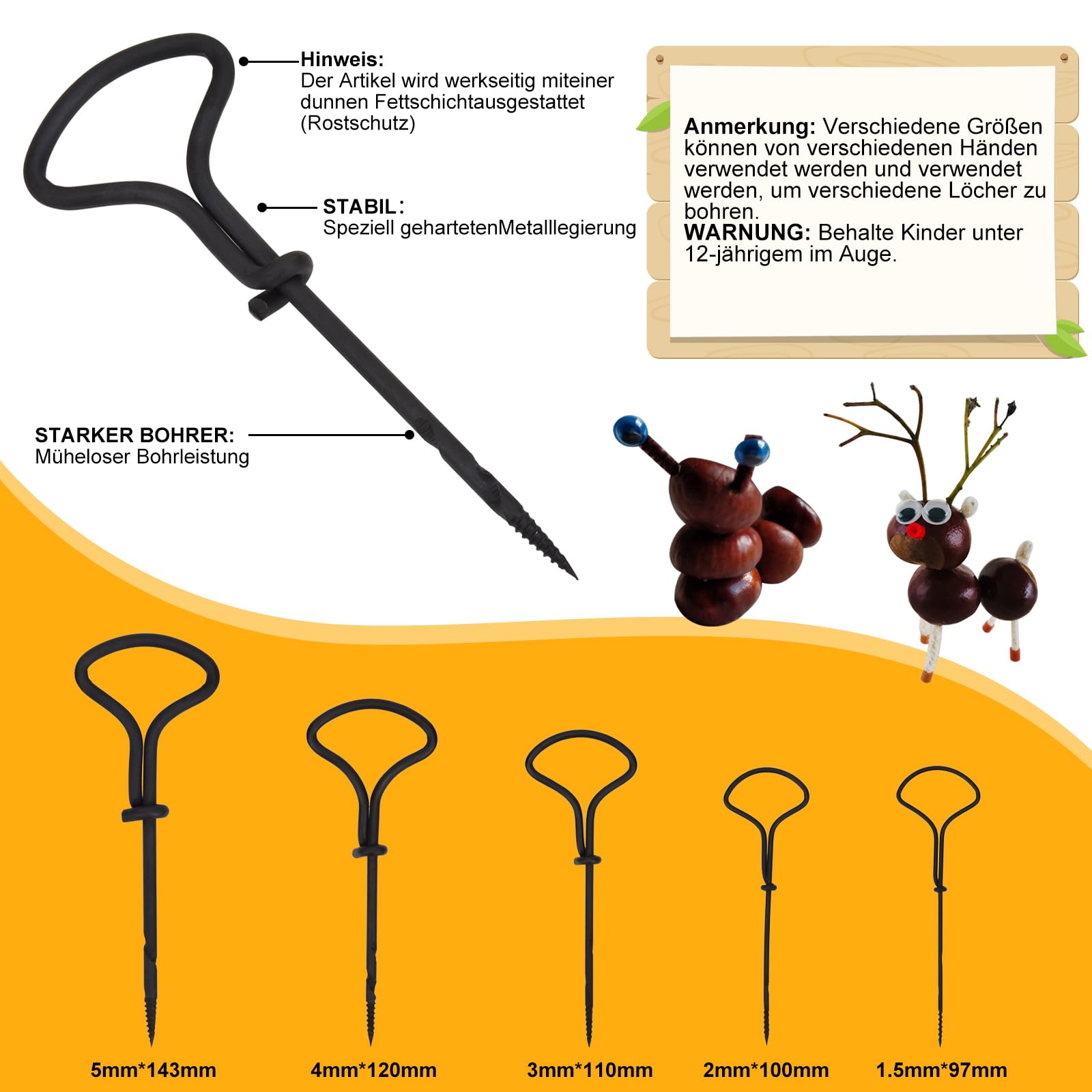 Herbstzeit ist Kastanienzeit! Mit diesem riesigen Bastelset mit 375 Teilen wird das Basteln mit Kastanien zum reinsten Vergnügen für Groß und Klein. Enthalten sind 5 praktische Handbohrer in verschiedenen Stärken (1,5-5 mm) aus Metall - die gehen super einfach durch Kastanien und Nüsse. Dazu gibt's jede Menge buntes Zubehör: 100 Pompons, 60 Wackelaugen, 20 Federn, 100 bunte Perlen, 30 Pfeifenreiniger und 70 Holz-Zahnstocher. So können die Kinder niedliche Kastanienmännchen, Tiere oder Fantasiefiguren basteln. Perfekt für Kindergeburtstage, Bastelnachmittage oder den Kindergarten. Wichtig: Enthält kleine Teile - daher nicht für Kinder unter 3 Jahren geeignet und immer unter Aufsicht basteln. Das Set fördert die Kreativität, die Feinmotorik und bringt die Kinder weg von Handy und Computer zurück zur Natur. Ob für zu Hause, Schule oder Kindergarten - mit diesem Set wird jeder Herbstnachmittag zum Bastelabenteuer!
