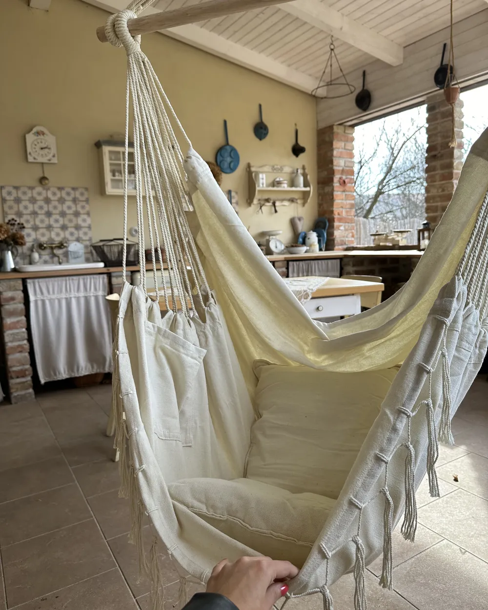 Deine Katze wird diesen Makramee-Hängesessel lieben! Aus natürlichem Baumwollseil handgeflochten - super weich und gelenkschonend. Mit 120x40cm Größe bietet er genug Platz zum Kuscheln und Schlummern. Das Netz-Design ist nicht nur hübsch anzusehen, sondern sorgt auch für gute Belüftung. Einfach aufhängen am Fenster, überm Schreibtisch oder im Außenbereich - deine Miez hat ihren eigenen Luxus-Platz. Die rutschfesten Knoten und verstärkten Ränder machen die Hängematte extra stabil. Perfekt für Katzen und kleine Hunde. Ein echter Hingucker im Boho-Stil!