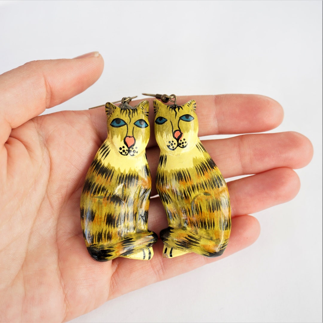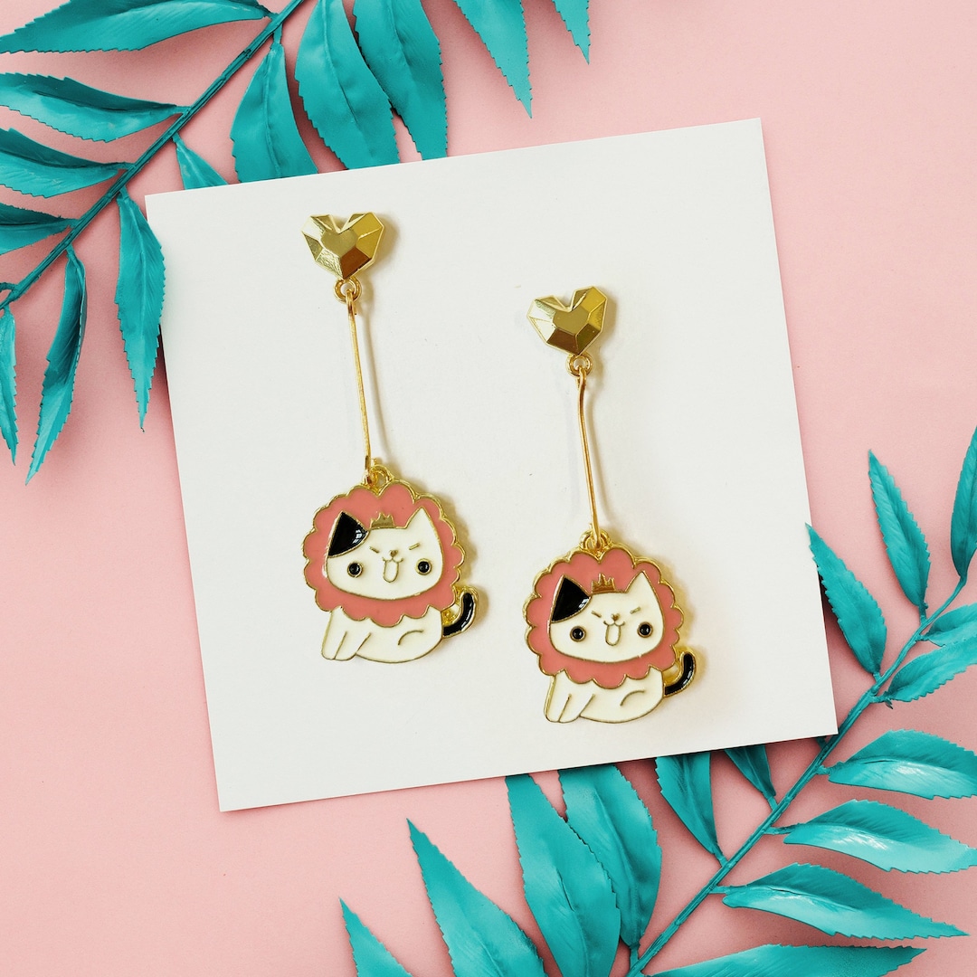 Asymmetrische Katzen Ohrringe - 2 Paar Emaille Ohrstecker Mit Cat Pendant