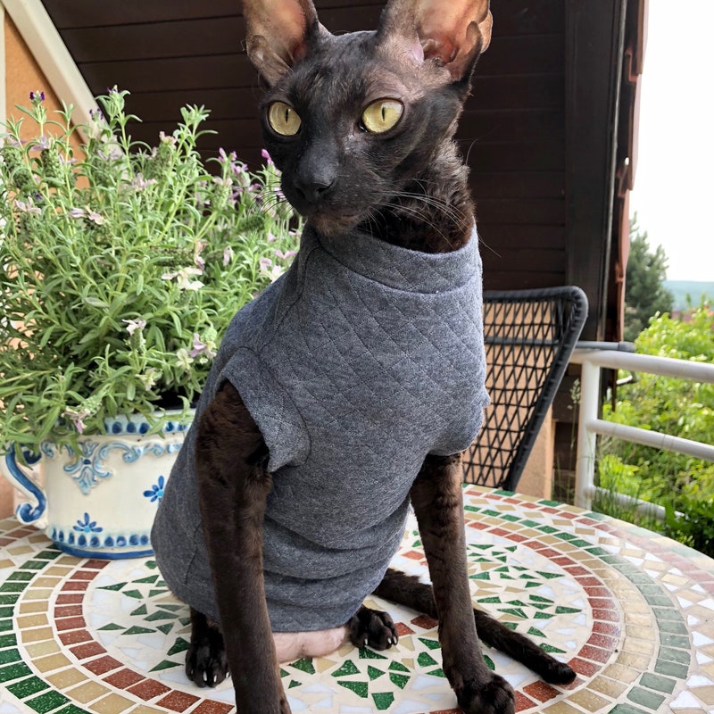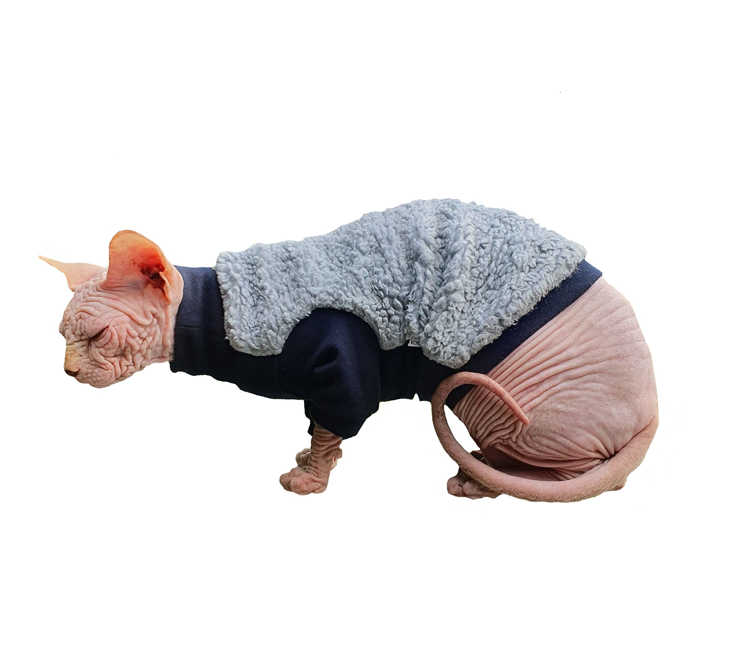So kuschelig weich für deine haarlose Katze! Dieser blaue Strickpullover von Kotomoda ist speziell für Sphynx, Devon Rex und andere Katzen ohne Fell entwickelt. Aus hautfreundlicher Bio-Baumwolle - super angenehm zu tragen. Nicht nur stylisch, sondern auch praktisch: wärmt bei Kälte und schützt bei Hitze. Perfekt für den Alltag, als Schlafanzug oder für besondere Anlässe wie Fotosessions. Wichtig: Vor dem Kauf unbedingt die Katze vermessen, denn die Größen sind speziell für haarlose Rassen ausgelegt. Ein super süßes Geschenk für jeden Katzenliebhaber!
