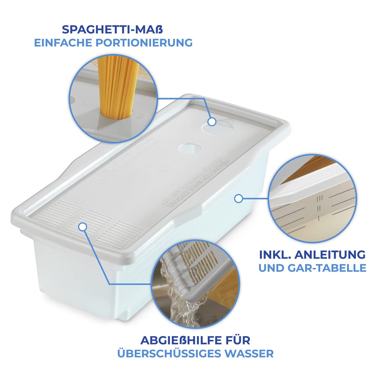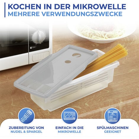 Pasta in Rekordzeit! Dieser praktische Nudelkocher für die Mikrowelle macht Schluss mit langem Warten auf kochendes Wasser. Einfach Nudeln und Wasser einfüllen, in die Mikrowelle stellen und in wenigen Minuten sind die Nudeln perfekt gar. Kein Überkochen, kein Anbrennen! Mit praktischer Wassermarkierung, Spaghetti-Maß und Abgießhilfe. Aus lebensmittelechtem PP-Kunststoff, spülmaschinenfest. Für bis zu 4 Portionen, auch für Spargel geeignet. Perfekt für Studenten, Berufstätige oder alle, die es schnell und unkompliziert mögen. So einfach war Nudelkochen noch nie!