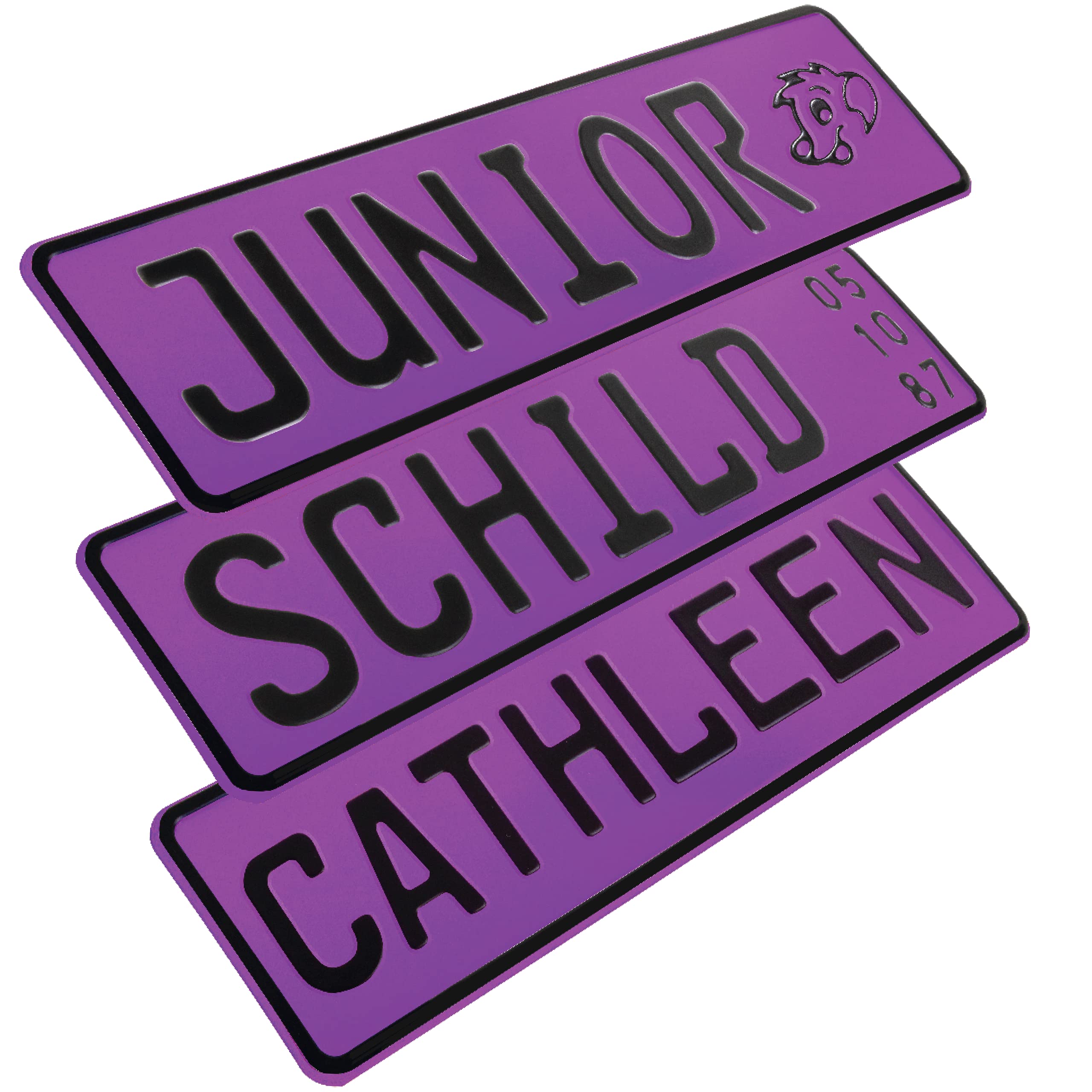 Ein eigenes Kennzeichen - wie die Großen! Dieses juniorgeeignete Alu-Schild in 34x9cm ist perfekt für Bobbycar, Kettcar oder die Kinderzimmertür. Aus dem gleichen 1mm starken Aluminium wie echte KFZ-Kennzeichen - nur etwas kleiner und kindgerechter. Du kannst es komplett individualisieren: Wunschtext, Farbe und ob mit Bohrungen oder Saugnäpfen. Der Text wird so positioniert, dass keine Bohrung durch Buchstaben geht - alles sauber gemacht! Jedes Kennzeichen wird in Deutschland einzeln geprägt und bei 200°C doppelt foliert - das macht es UV-, kälte- und hitzebeständig. Perfekt als Geburtstagsgeschenk oder einfach nur zum Spaß - Qualität, die lange hält und immer wieder Freude macht!