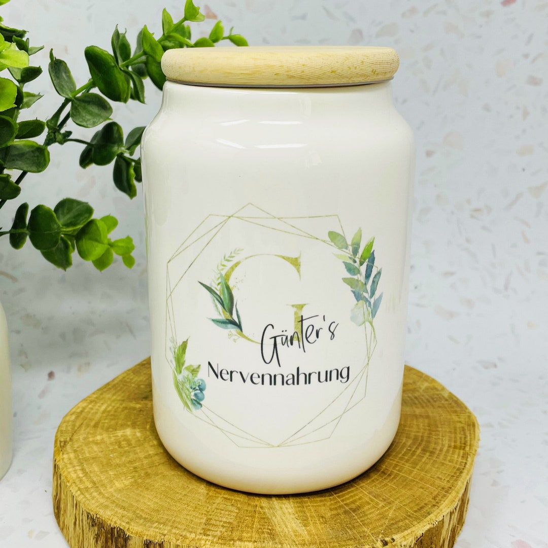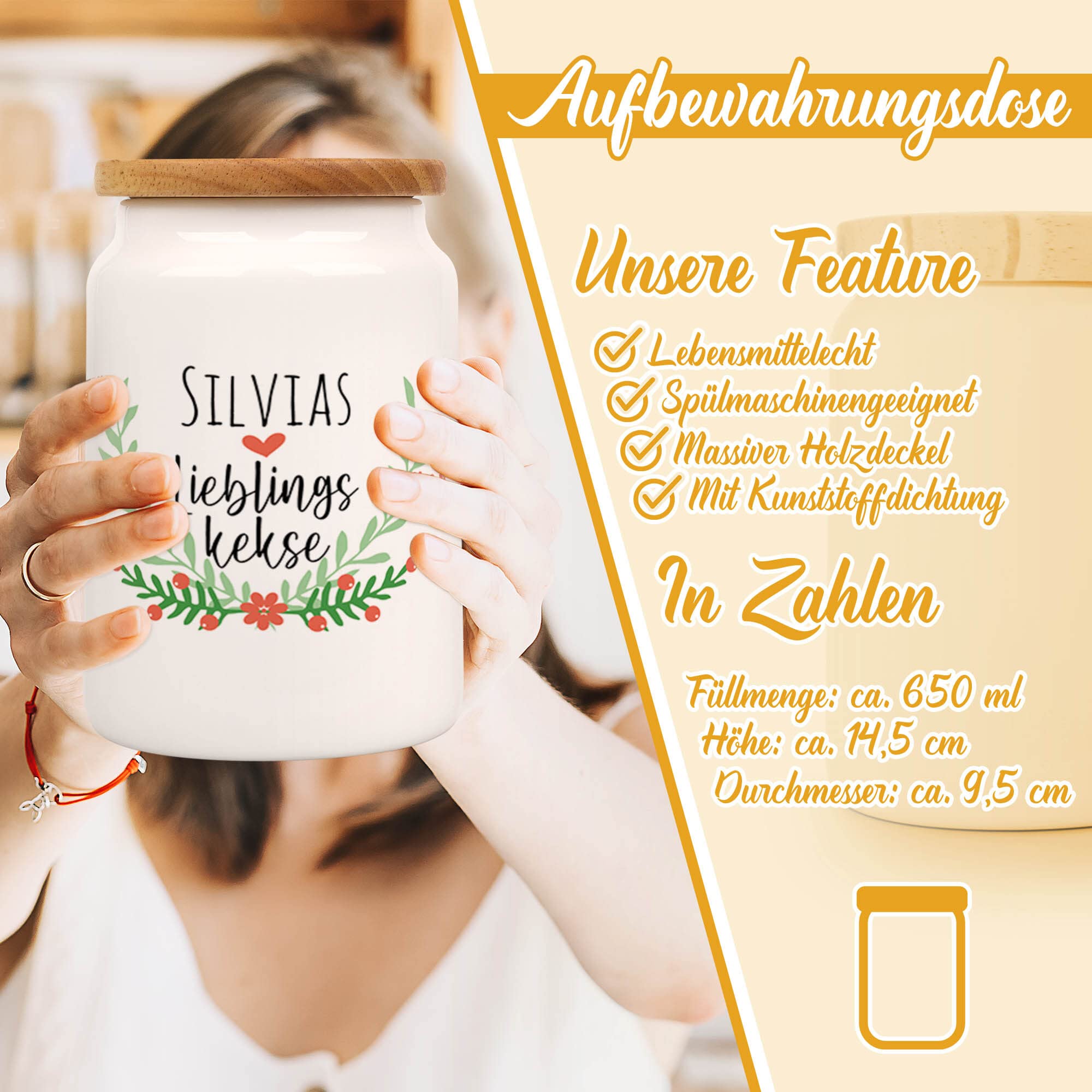 Wow, was für eine süße Geschenkidee! Diese Keksdose aus hochwertiger Keramik kannst du mit jedem Namen personalisieren lassen - perfekt für Oma, Mama, beste Freundin oder einfach für dich selbst. Die Dose hat 650ml Fassungsvermögen, ist 14,5cm hoch und hat 9,5cm Durchmesser. Mit nem schicken Holzdeckel der ne Gummidichtung hat - also luftdicht und aromasicher! Deine Kekse bleiben ewig knusprig und frisch. Spülmaschinenfest ist sie auch, also super easy zu reinigen. Sieht total edel aus im Küchenregal und ist gleichzeitig mega praktisch. Made in Germany von PRINT ROYAL - Qualität die man sieht! Ob zu Weihnachten, Geburtstag oder einfach so - damit machst du garantiert Freude. Einfach beim Bestellen den Wunschnamen angeben und schon kriegst du eine ganz persönliche, einzigartige Dose die niemand anders hat. Süß, praktisch UND persönlich - besser geht's nicht!