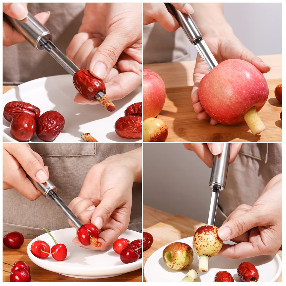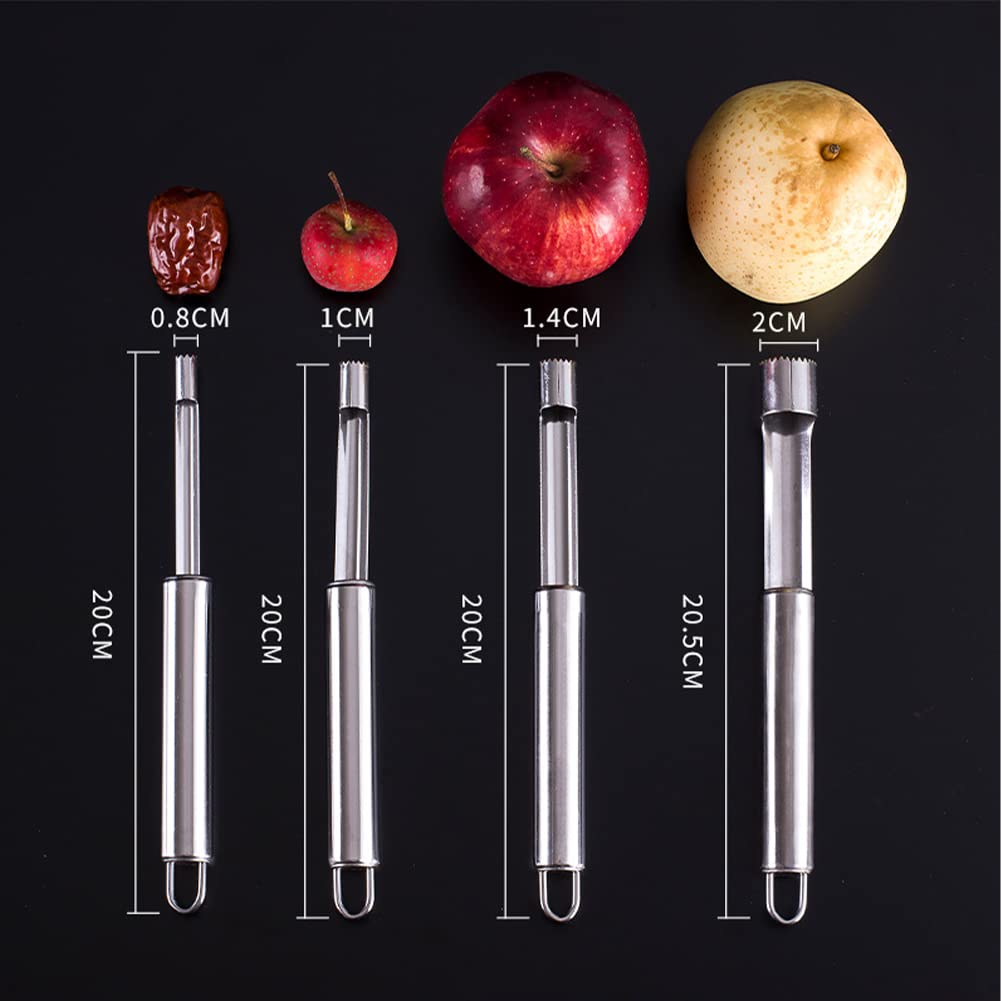 Mega praktisch für alle Obst-Fans! Dieses 4-teilige Obstkerner-Set aus rostfreiem 410er Edelstahl macht das Entkernen zum Kinderspiel. Perfekt für Äpfel, Birnen, Kirschen, rote Datteln und vieles mehr. Jedes Tool hat die ideale Größe für verschiedene Früchte - von Kirschen bis zu großen Äpfeln. Der ergonomische Griff liegt super in der Hand und ermöglicht müheloses Entkernen. Einfach in die Frucht drücken, drehen - schon ist der Kern entfernt und die Frucht bleibt schön ganz! Absolute Zeiter-sparnis in der Küche. Einfach zu reinigen - einfach unter fließend Wasser abspülen oder in die Spülmaschine geben. Rostfrei, korrosionsbeständig und verzieht sich nicht - hält ewig! Must-Have für jeden, der gerne Obst isst, Kuchen backt oder Marmelade kocht. Macht die Obstzubereitung so viel einfacher und schneller. Dein neuer liebster Küchenhelfer für gesunde Ernährung!