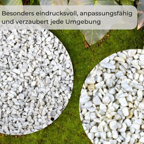 Das Material ist natürlich, langlebig und behält seine strahlende Weiße auch bei Outdoor-Nutzung. Einfach verteilen und schon verwandelt sich dein Zuhause in eine Oase der Ruhe und Eleganz. Egal ob für drinnen oder draußen - dieser Marmor Kies setzt edle Akzente!