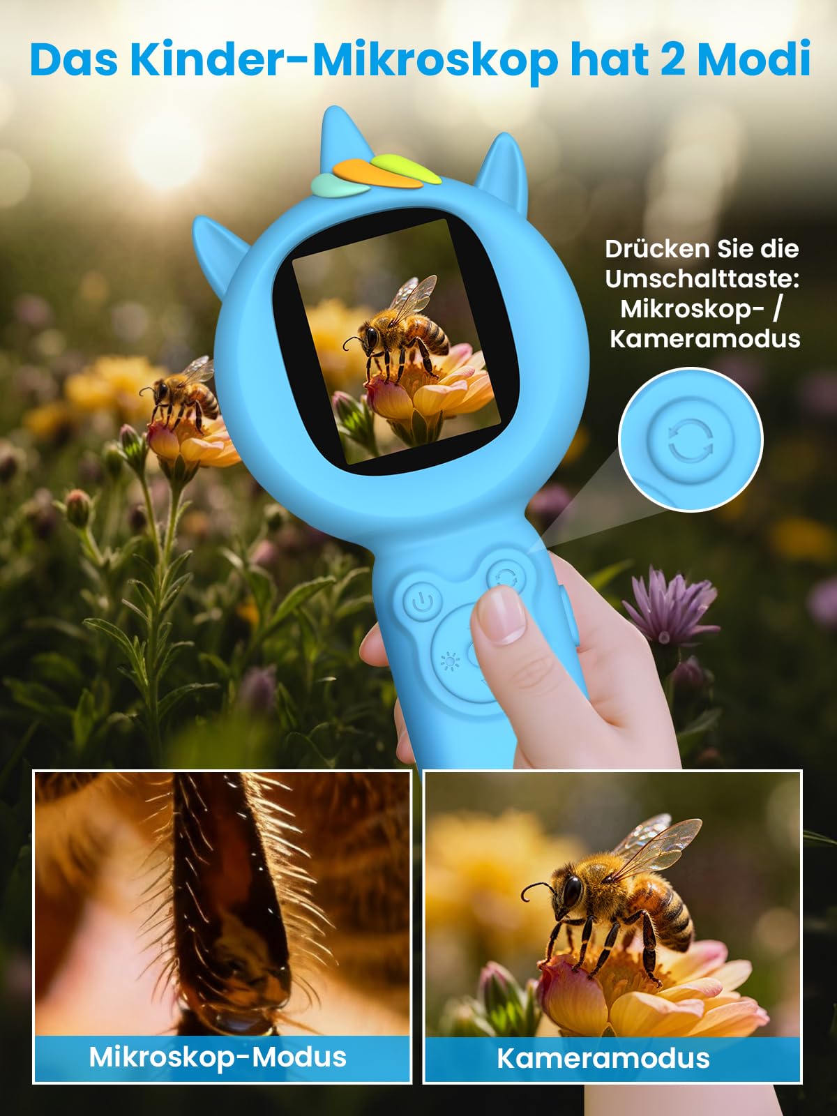 Abenteuer Wissenschaft für neugierige Entdecker! Dieses coole Mikroskop hat ein 2-Zoll-Display und bringt die Welt bis zu 500-fach vergrößert auf den Bildschirm. Mit Autofokus - einfach Knopf drücken und loslegen! 8 LEDs sorgen für perfekte Beleuchtung. Als Kamera und Mikroskop in einem speichert es Fotos und Videos. Wiederaufladbar und superleicht (nur 100g) - ideal für unterwegs. Kompatibel mit PC und Mac. Perfektes Geschenk für kleine Forscher ab 6 Jahren! So macht Lernen Spaß!