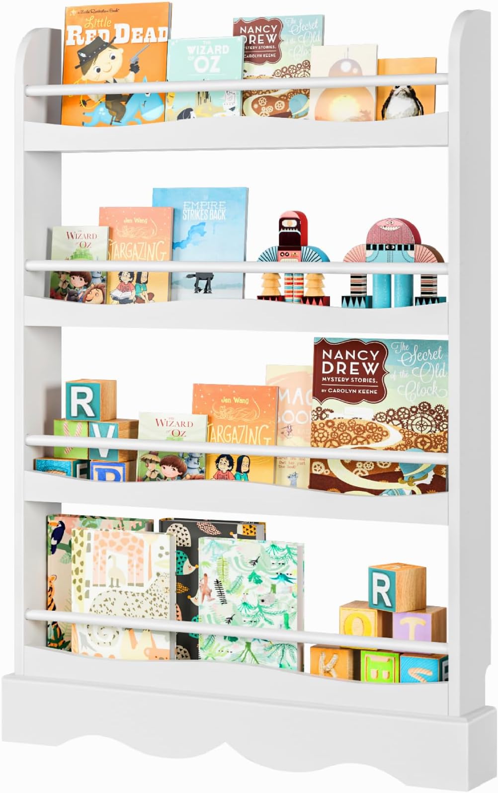 Mama, Papa - aufgeräumt ist doch viel schöner! Dieses süße Bücherregal im Kinderzimmer sieht nicht nur gut aus, sondern bringt auch Ordnung ins Chaos. Mit seinen 4 Etagen bietet es jede Menge Platz für Bilderbücher, Spielzeug und alles, was dein Kind so sammelt. Und das Beste: Die Kleinen kommen super einfach ran und lernen so spielerisch, selbst Ordnung zu halten! Das Regal ist aus 100% massivem Kiefernholz gemacht - stabiler als diese billigen Plastikteile und dabei total natürlich. Die Oberfläche ist handgeschliffen, damit sich dein Kind keine Splitter holt. Und die abgerundeten Ecken sorgen für extra Sicherheit. Mit nur 10cm Tiefe ist es super platzsparend und passt auch in kleinere Ecken. Ob im Kinderzimmer, Spielzimmer oder sogar im Wohnzimmer - dieses Regal macht überall was her! Der Aufbau? Total easy! Alles ist vorgebohrt, die Anleitung ist verständlich und das Werkzeug liegt dabei. Und wenn's mal dreckig wird - einfach mit einem feuchten Tuch abwischen. So bleibt mehr Zeit zum Vorlesen und Spielen! Übrigens: Die offene Bauweise regt die Kreativität an und die kleinen Geländer auf jeder Ebene verhindern, dass was runterfällt. Einfach praktisch!
