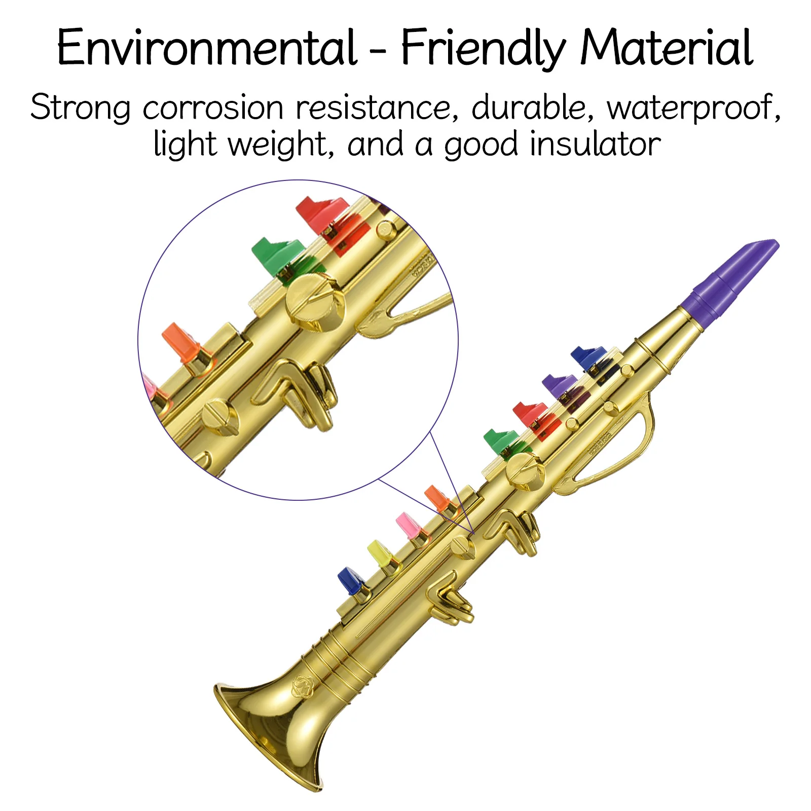 Diese süße Klarinette ist das perfekte Einsteiger-Instrument für kleine Musikfans! Aus umweltfreundlichem ABS-Material in Gold oder Silber, ist sie 37,5cm lang und damit ideal für Kinderhände. Mit 8 bunten Tasten können die Kleinen verschiedene Töne und Melodien entdecken - ein super Einstieg in die Welt der Musik! Das realistische Design sieht aus wie eine echte Klarinette und macht das Spielen noch authentischer. Nicht nur lustig, sondern auch pädagogisch wertvoll: Feinmotorik, Hand-Auge-Koordination und musikalische Fähigkeiten werden spielerisch gefördert. Perfekt als Geschenk für Geburtstage, Weihnachten oder einfach so. Einfach zusammenstecken und losmusizieren - dein Kind wird begeistert sein!