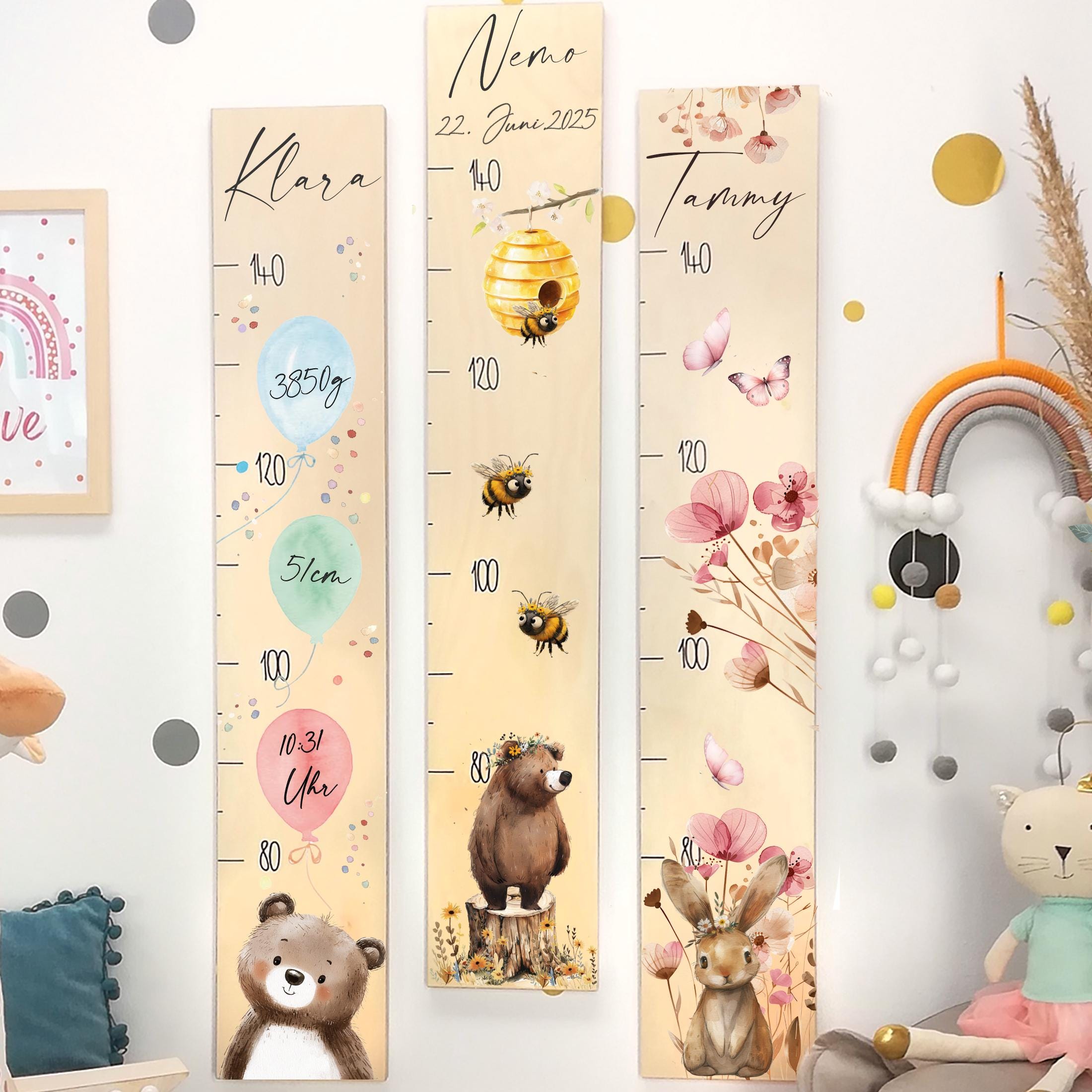 Wie süß ist denn diese Prinzessinnen-Messlatte von MouseHouse? In zartem Rosa mit niedlichen Prinzessinnen-Motiven, Schmetterlingen und Herzen wird sie zum absoluten Hingucker in jedem Mädchenzimmer. Aus Holz gefertigt, 80 cm lang, 12 cm breit und 4 cm tief - perfekt für die Wand über dem Bett oder neben der Tür. Die Messskala geht von 70 bis 150 cm, also begleitet sie deine Kleine durch die ganze Kindheit. Mit praktischem Schmetterlings-Clip zum Markieren der aktuellen Größe. Besonders clever: Sie lässt sich zusammenfalten für individuelle Abschnitte. Perfekt als Geschenk zur Geburt, zum Geburtstag oder einfach so. Dazu gibt's passende Accessoires wie Aufhänger und Fotorahmen. Ein zeitloses Stück, das über Jahre Freude macht und die schönsten Erinnerungen festhält!
