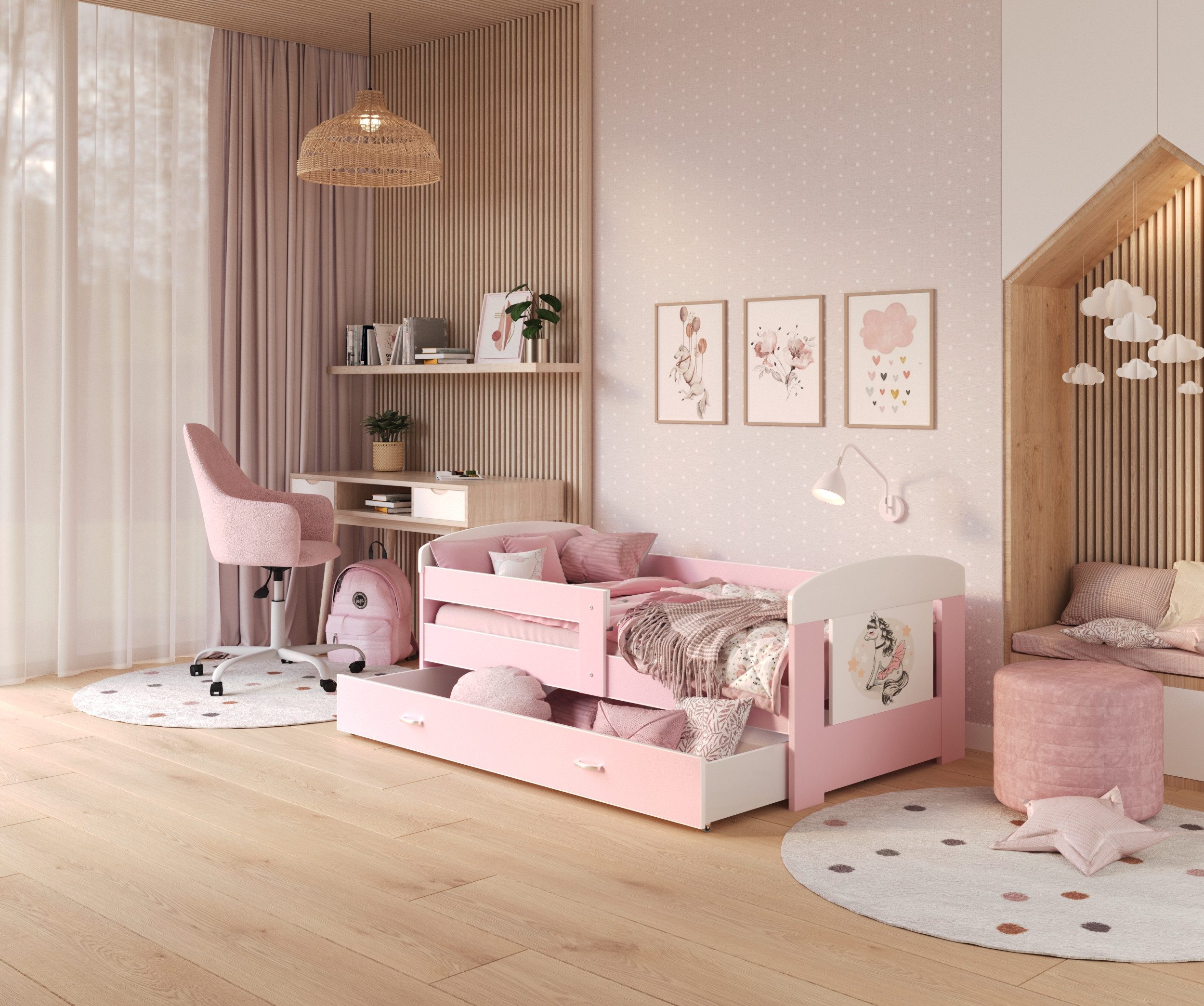 Das perfekte erste Bett für dein Kind! Dieses Bjird Kinderbett in 70x140cm bietet alles, was man braucht. Mit dem verstellbaren Rausfallschutz (100cm) musst du dir keine Sorgen machen, dass dein Kleines nachts herausfällt. Das Besondere: Das Bett ist zweiseitig aufbaubar - du entscheidest, auf welcher Seite die praktische Schublade und der Rausfallschutz sein sollen. Im Lieferumfang ist alles enthalten: eine 8cm dicke Schaummatratze mit waschbarer Hülle, ein Lattenrost aus Kiefernholz und ein rollbarer Bettkasten für Stauraum. Die abgerundeten Ecken sorgen für zusätzliche Sicherheit. Und das Beste: Das Bett hält bis zu 100kg aus, sodass auch Mama oder Papa mal zum Vorlesen mit drauf sitzen können. Aus hochwertiger laminierter Möbelplatte gefertigt und mit umweltfreundlichen Farben lackiert. Wird in 2 Paketen geliefert - praktisch für den Transport!