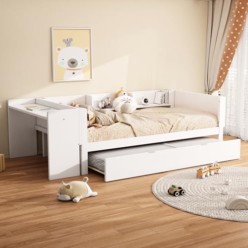 Dieses Kinderbett ist einfach genial durchdacht! Mit 90x200cm Standardgröße plus integriertem Schreibtisch und ausziehbarer Gästebett-Funktion. Aus massivem Kiefernholz und MDF - super robust und langlebig. Das ausziehbare Rollbett ist perfekt für Übernachtungen von Freunden oder Geschwistern. Der Schreibtisch kann am Kopf- oder Fußende montiert werden - super praktisch für Hausaufgaben und Malen. Drei seitliche Regale bieten jede Menge Stauraum für Bücher, Spielzeug und Kleinkram. Spart mega Platz im Kinderzimmer und sieht dabei noch total schick aus! Einfach zu montieren mit klarer Anleitung. Ohne Matratze - du kannst dir deine Lieblingsmatratze aussuchen. Einfach das perfekte Bett fürs Kinderzimmer!