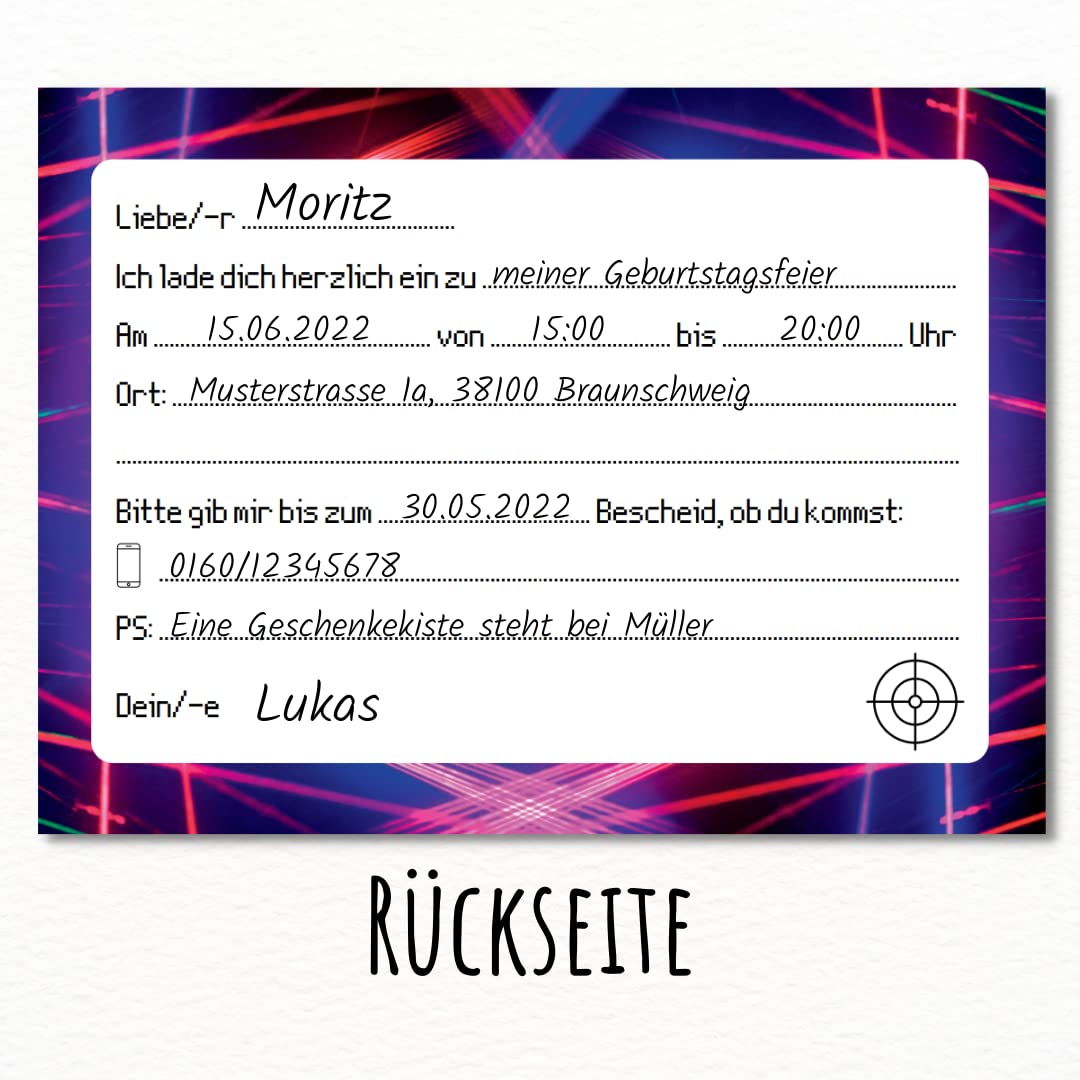 Wow, was für coole Einladungskarten! Dieses Set mit 12 Karten im Lasertag-Design ist perfekt für den nächsten Kindergeburtstag. Im praktischen DIN A6 Format (14,8x10,5cm) mit vorbereiteten Feldern zum Ausfüllen - so geht das Beschriften ratzfatz! Hergestellt aus hochwertigem 250g Chromkarton, der einseitig silberglänzend ist. Die Rückseite ist matt und lässt sich super mit allen gängigen Stiften beschreiben. Made in Germany mit klimaneutralem Druck - da kannst du mit gutem Gewissen bestellen! Die Karten haben nicht nur Platz für die wichtigsten Infos wie Datum, Uhrzeit und Ort, sondern auch ein Extrafeld für Geschenkewünsche oder andere Hinweise. Ob für die Lasertag-Party, den Action-Geburtstag oder einfach eine coole Feier - diese Einladungen kommen garantiert gut an! Dein Kind wird sich riesig freuen, wenn es diese stylischen Karten an seine Freunde verteilen kann. Einladungskarten, die wirklich was hermachen!