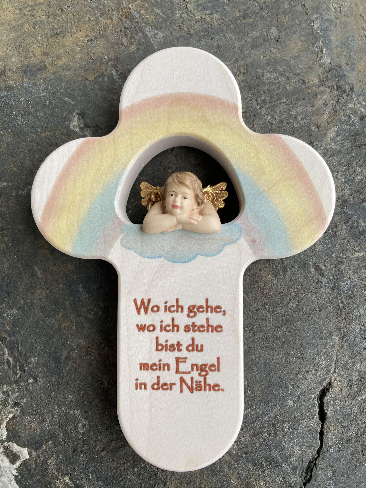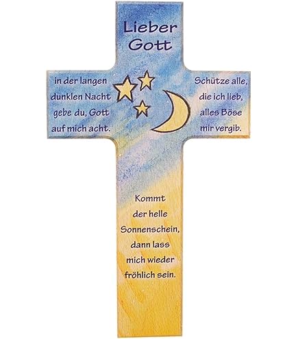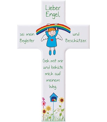 Oh, dieses Kinderkreuz ist einfach nur niedlich! Mit dem Spruch 'Schutzengel mein lass mich dir befohlen sein' - was für eine schöne Gute-Nacht-Botschaft für die Kleinen. Das 20 cm große Holzkreuz hat einen bunten Regenbogen, einen knienden Engel, Marienkäfer und Mond und Sonne die sich Gute Nacht sagen. Das Highlight: Ein handgefertigter Ton-Engel der ganz viel Schutz und Geborgenheit ausstrahlt. Auf der Rückseite ist eine Bohrung für einfache Wandmontage. Perfekt als Geschenk zur Geburt, Taufe oder Geburtstag - und du kannst es sogar mit dem Namen des Kindes personalisieren! Hergestellt in Deutschland mit viel Liebe zum Detail.