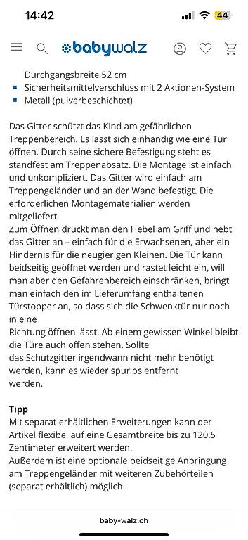 Die schwenkbare Tür mit 2-Aktionen-Verschluss öffnet sich leicht mit einer Hand - aber nur für Erwachsene! Der enge Sprossenabstand verhindert Quetschungen.