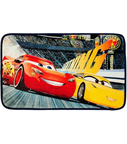 Vollgas für's Kinderzimmer! Dieser coole Cars 2 Teppich zeigt die Rivalen McQueen und Francesco im spannenden Duell. Mit 80x120cm ist er perfekt für's Spielen und liegt dank Anti-Rutsch-Rücken aus Latex bombenfest. Der Teppich ist nur 6,5mm flach, aber super strapazierfähig. Die Oberseite aus 100% Polyamid ist schadstoffgeprüft und kann sogar von Hand gewaschen werden. Die umkettelte Randverstärkung sorgt dafür, dass nichts ausfranst. Ein offizielles Lizenzprodukt von Disney, das kleine und große Cars-Fans begeistert. Übrigens: Auf manchen Bildschirmen kann die Farbe etwas anders aussehen - aber der Teppich ist garantiert genauso cool wie im Film!
