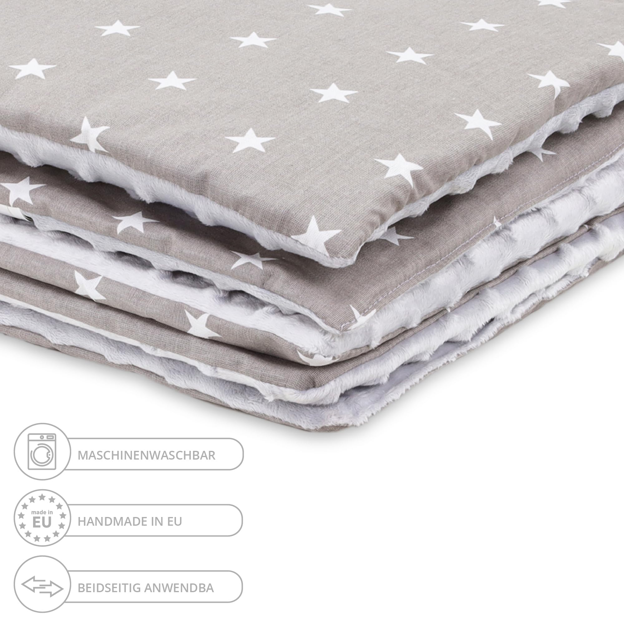Für alle kleinen Schnuffelkissen, die es kuschelig lieben! Diese Totsy Baby-Decke ist auf einer Seite weiche Baumwolle für warme Tage, auf der anderen kuscheliger Plüsch für kalte Tage - einfach umdrehen, je nachdem was gebraucht wird. Mit 75x100cm ist sie perfekt für Kinderwagen, Bettchen oder einfach zum Draufkuscheln. Und das 35x30cm Kissen macht das Set komplett. Alles OEKO-TEX zertifiziert, also unbedenklich für zarte Babyhaut. In Europa genäht, mit Liebe zum Detail. Waschbar bei 30°C - praktisch, wenn mal was daneben geht. Ob als Geschenk zur Geburt, Taufe oder einfach so - diese Decke begleitet dein Kleines durch die ersten Jahre. Weich, sicher und total stylisch!