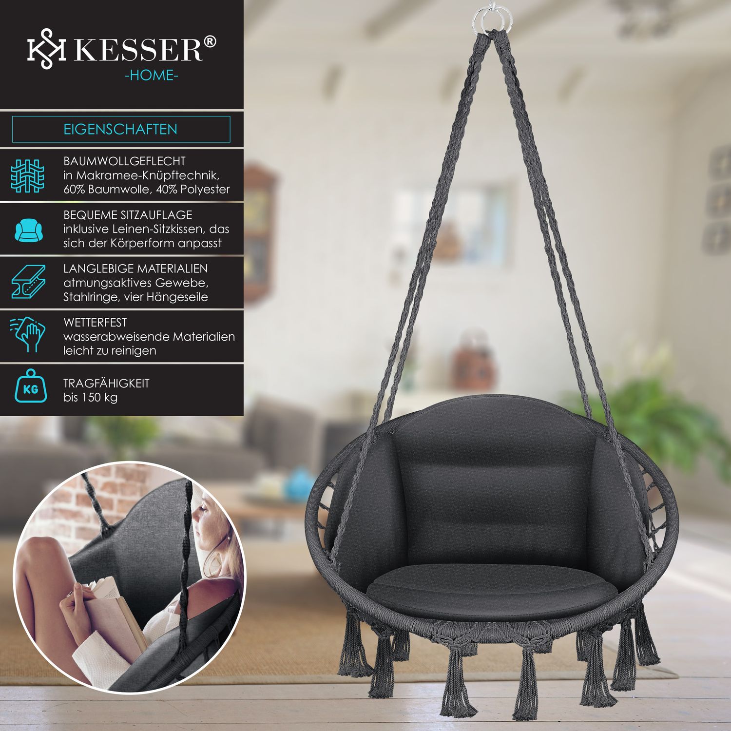 Ach, wie gemütlich! Dieses weiße Hängesessel-Kissen macht deine Hängematte oder Hängeschaukel noch bequemer. Mit der dicken, hochdichten Baumwoll-Füllung sitzt du wie auf Wolken!\n\nDas Kissen ist mit praktischen Gurten ausgestattet, damit es nicht verrutscht - egal wie sehr du schaukelst. Und die wasserabweisende Oberfläche aus Polyester hält leichte Regenschauer aus und ist super leicht zu reinigen.\n\nPerfekt für den Garten, Balkon, Terrasse oder sogar innen im Wohnzimmer. Das stylische weiße Design passt zu jeder Einrichtung und macht sofort eine gemütliche Atmosphäre.\n\nNach dem Schaukeln einfach mit einem feuchten Tuch abwischen oder bei Bedarf in der Maschine waschen - praktischer geht's nicht!\n\nAchtung: Das Kissen wird platzsparend verpackt und braucht nach dem Auspacken etwa 4-5 Stunden, um sich voll zu entfalten. Einfach in Ruhe lassen und abklopfen - dann ist es ready for action!\n\nOb für deine Hängematte, den Hängestuhl, Schaukelkorb oder andere Sitzmöbel - dieses Kissen verwandelt jede Sitzgelegenheit in eine Wohlfühloase. Endlich richtig gemütlich entspannen!