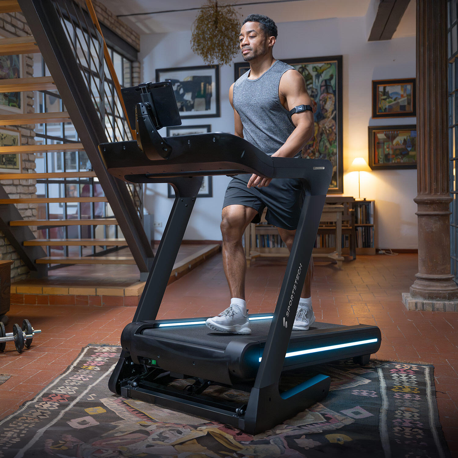 Professionelles Training für zu Hause! Das Sportstech sTread Pro Laufband überzeugt mit einem starken 7-PS Motor, Geschwindigkeiten bis 20 km/h und 15 Steigungsstufen. Das große 21,5-Zoll Display lässt sich 360° drehen - perfekt für kombiniertes Training. Mit LED-Beleuchtung, App-Kompatibilität und praktischer Klappfunktion. Die große Lauffläche (150x50 cm) und das Dämpfungssystem schonen deine Gelenke. Bis 150 kg belastbar - deutsche Qualität mit 2 Jahren Garantie!