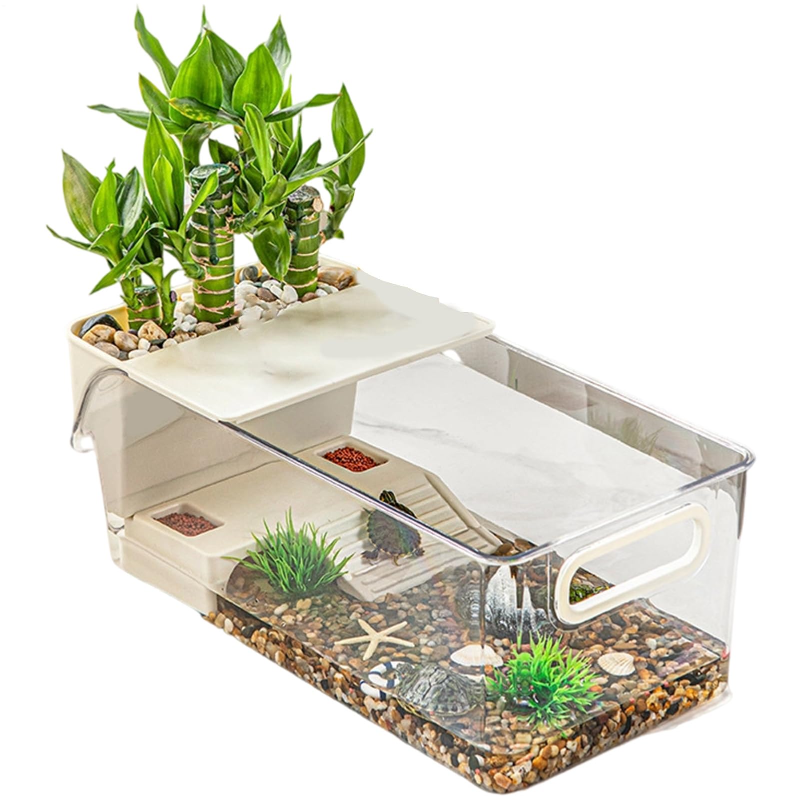 Suchst du ein neues Zuhause für deine Schildkröte, deinen Gecko oder andere kleine Reptilien? Dieser klare Acryl-Schildkrötenpanzer ist genau das Richtige! Mit seiner stabilen PC-Konstruktion und der hohen Transparenz hast du deine Lieblinge immer im Blick. Die integrierte Landzone mit Börsenstufe bietet den Tieren perfekte Bedingungen - ob für Wasserschildkröten, die mal an Land wollen, oder für Geckos, die klettern möchten. In zwei Größen erhältlich: Groß (ca. 37x18,9x13 cm) und Klein (ca. 32x16x12 cm). Super für Krabben, Frösche oder kleine Fische. Das Design fördert sauberes Wasser und bietet Platz für Wasserpflanzen. Einfach zu reinigen, robust und langlebig - deine tierischen Mitbewohner werden's lieben!