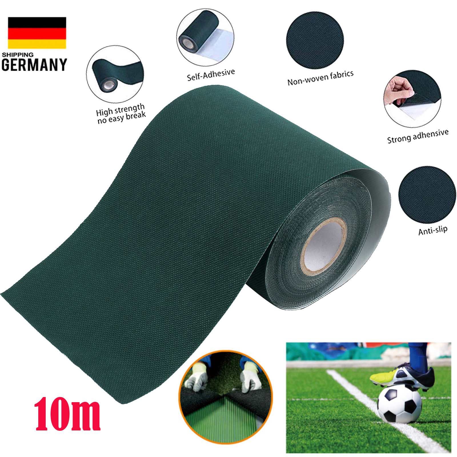 Perfekt für dein Kunstrasen-Projekt! Dieses professionelle Klebeband macht die Verlegung deines Rasenteppichs zum Kinderspiel. Mit 15cm Breite und 5m Länge hast du genug Material für größere Flächen. Das Band ist selbstklebend und haftet sofort sicher auf dem Untergrund. Die wasserdichte und wetterfeste Beschichtung macht es ideal für den Außenbereich - egal bei welchem Wetter! Aus hochwertigem Vliesstoff mit PVC-Folie gefertigt, bietet es eine starke Haftung von bis zu 4kg Schälfestigkeit. Die Innenseite ist praktisch in zwei Teile geteilt für einfache Handhabung. Einfach die Schutzfolie abziehen, das Band an den Nahtstellen anbringen und dein Kunstrasen darauf fixieren. In dunkelgrüner Farbe passt es perfekt zu deinem Rasen und ist kaum sichtbar. Hol dir jetzt dieses zuverlässige Klebeband und verlege deinen Kunstrasen wie ein Profi!
