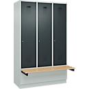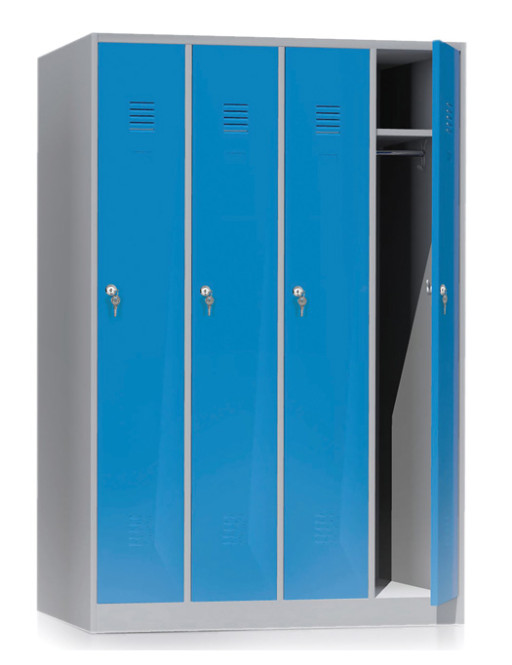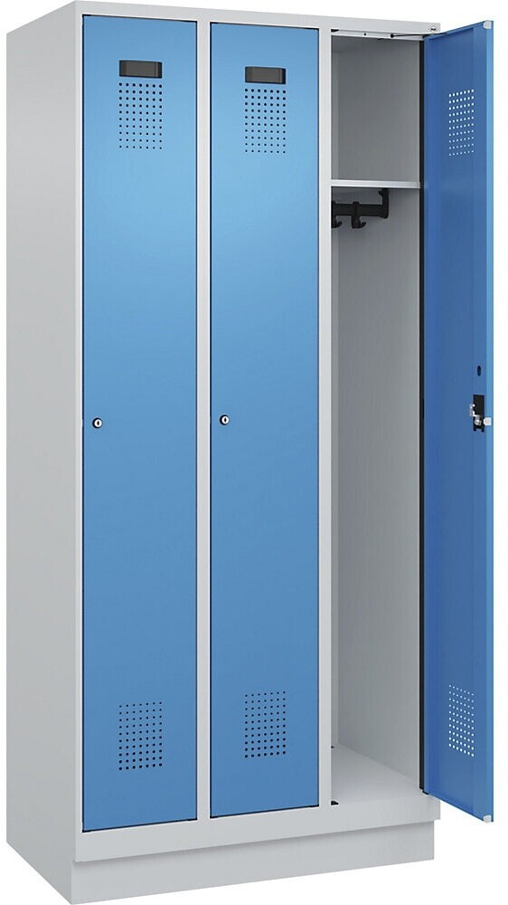 Perfekt für Umkleiden in Unternehmen, Schulen oder Sporteinrichtungen! Dieser stabile Kleiderspind aus Stahlblech bietet drei geräumige Abteile à 300 mm Breite. Jedes Fach ist ausgestattet mit einer Kleiderstange, zwei praktischen Schiebehaken und einem extra Hutboden. Die Lüftungsschlitze sorgen für Frische, während der Drehriegelverschluss deine Sachen sicher verwahrt - einfach ein Vorhängeschloss dranhängen und fertig! Die Oberfläche ist kunststoffbeschichtet in lichtgrau (RAL 7035) mit blauen Türen, was nicht nur gut aussieht, sondern auch super leicht zu reinigen ist. Mit den Maßen 1800x900x500 mm (HxBxT) bietet der Spind reichlich Platz ohne viel Raum einzunehmen. Der stabile Sockel gibt zusätzlichen Halt und die geschweißte Konstruktion garantiert Langlebigkeit. Ob im Betrieb, Fitnessstudio oder Schwimmbad - hier bleibt deine Garderobe immer ordentlich und sicher!