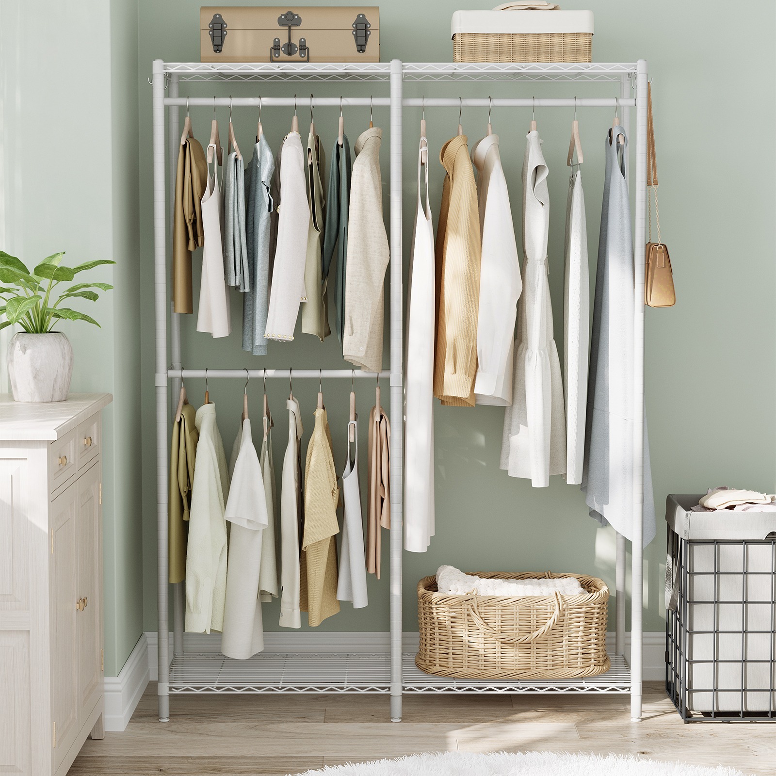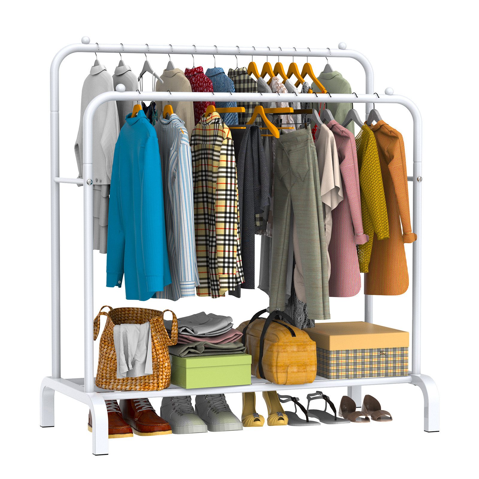 Dieser iSunirm Kleiderständer ist die perfekte Lösung für mehr Ordnung im Schlafzimmer! Als L-förmiges Eck-System super platzsparend - ideal für kleine Räume und Wohnungen. Mit 3 praktischen Stoffschubladen für Socken, Unterwäsche und Accessoires. Dazu eine Garderobe für Hemden, Jacken und Kleider, ein Schuhregal und eine obere Ablagefläche. Maße: 166,4 cm L x 39,4 cm B x 190,0 cm H - das ist richtig viel Stauraum! Aus robustem Metallrahmen mit dicken Holzplatten - trägt bis zu 1000 Pfund! Die einzelnen Hängestangen halten bis zu 54,4 kg. Besonders flexibel: Kann sowohl als Ecke als auch gerade aufgestellt werden. Einfache Montage mit beiliegender Hardware und Werkzeug. Perfekt für Studentenwohnungen, Gästezimmer oder als Ergänzung zum Hauptschrank. Bring Ordnung in dein Leben!