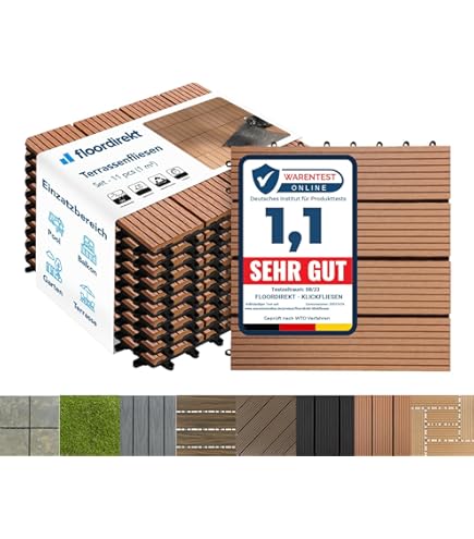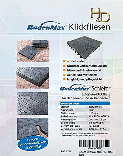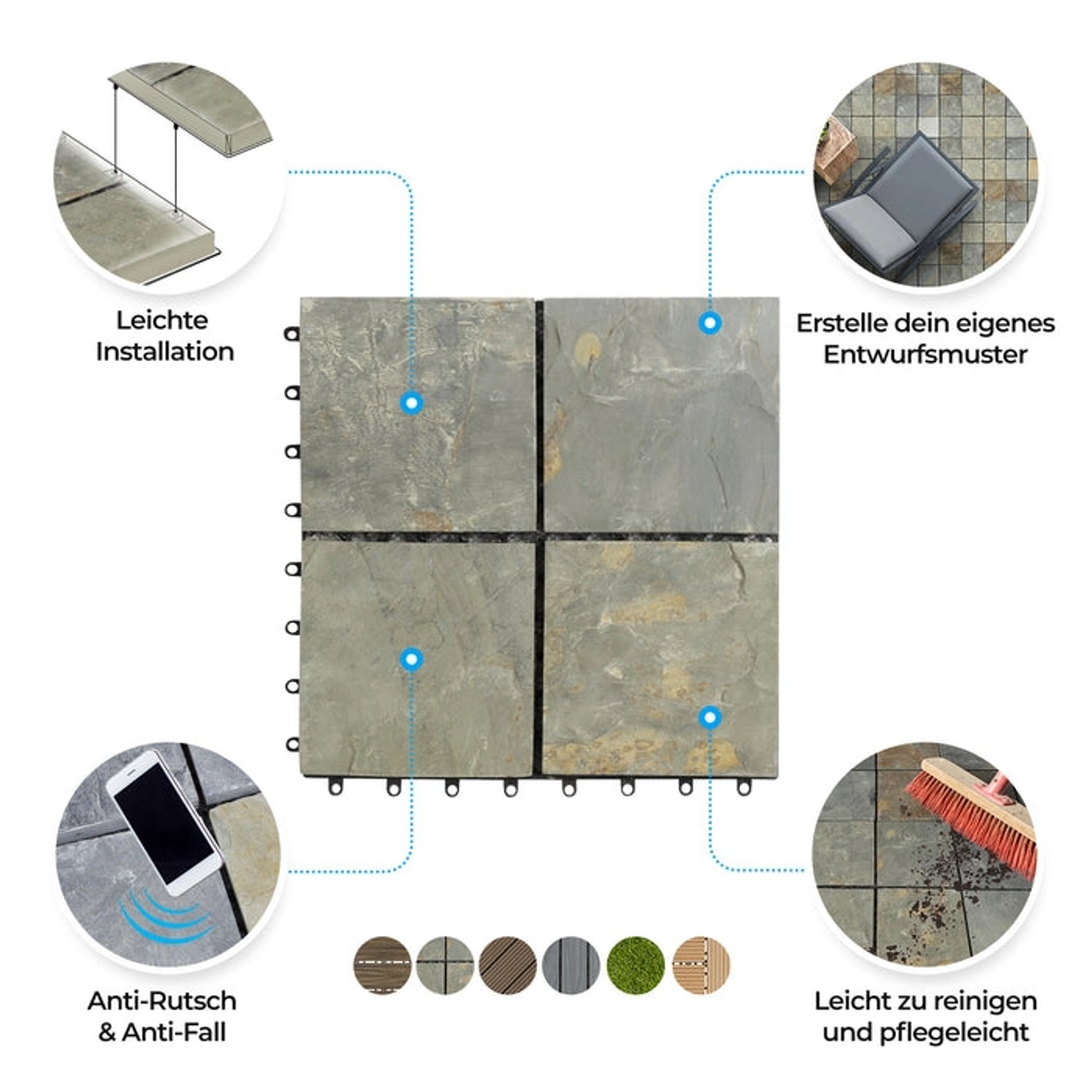 Wow, diese Kieselstein-Platten sehen einfach natürlich schön aus! Mit dem 11er-Set deckst du ganze 1㎡ Fläche ab - perfekt für Terrasse, Balkon oder Gartenteich. Die unregelmäßigen Steine haben was ganz Besonderes, oder? \\n\\nDas coole Klicksystem macht die Montage super einfach: Einfach die Clips ausrichten, zusammendrücken - schon hast du deine Wunschfläche zusammengebaut. Und das Beste: Die gitterartige Unterlage sorgt dafür, dass Regenwasser super abfließt. Keine Pfützen mehr! \\n\\nDie Platten sind aus stabilem Einteil-Kunststoff, halten Druck stand und machen auch bei Sonne und Regen nicht schlapp. Einmal im Jahr mit Essig reinigen - dann hast du lange Freude an dem natürlichen Look! \\n\\nMaße: 30x30cm, Stärke 20mm \\nMaterial: Echte Kieselsteine + PVC \\nFarben: Mehrere Naturtöne zur Auswahl
