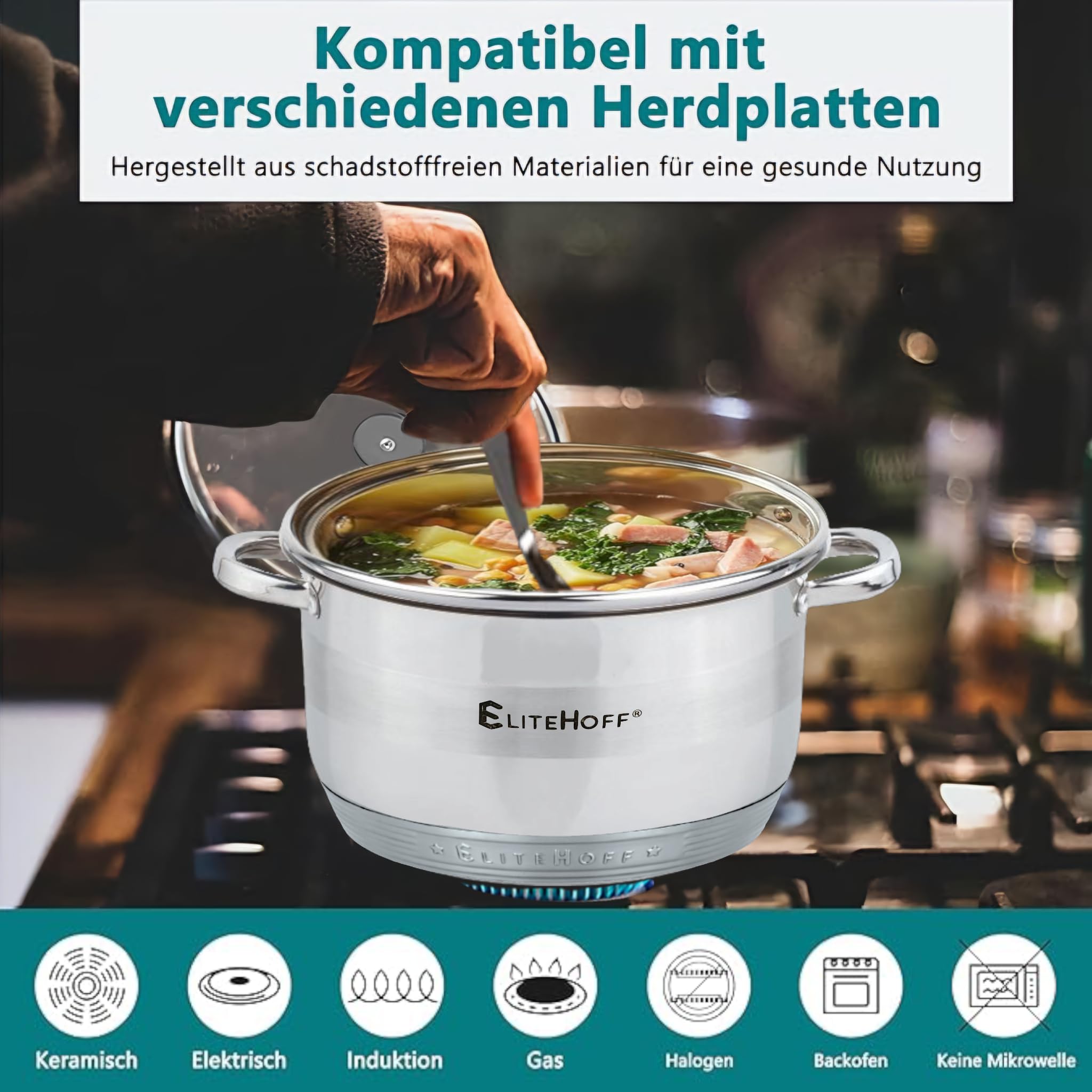 Wow, diese Hooz Edelstahltöpfe sind echt praktisch! Egal ob du Induktion, Ceran oder Gas hast - die funktionieren auf allem. Aus hochwertigem Edelstahl mit gebürsteter Oberfläche, die sich super leicht reinigen lässt. Die hitzebeständigen Griffe verbrennen dir nicht die Finger, und der dicke Thermoboden verteilt die Hitze gleichmäßig. Es gibt 12 verschiedene Größen von 1,4 bis 12,7 Liter - da ist für jede Küche der passende Topf dabei. Ob für Suppe, Nudeln oder Gemüse - damit kochst du wie ein Profi! Jeder Topf kommt natürlich mit passendem Glasdeckel. Einfach klasse für den täglichen Gebrauch!