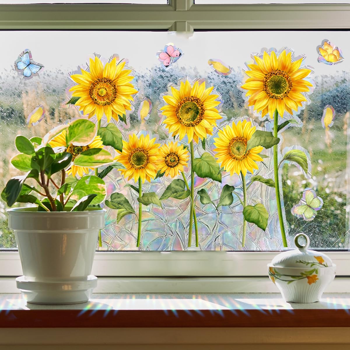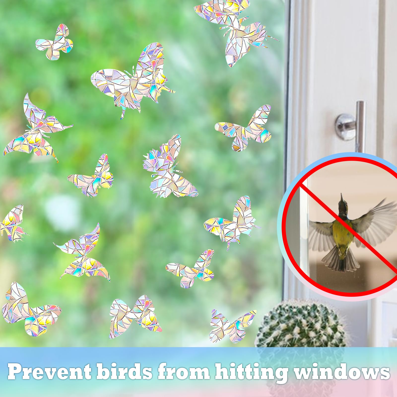 Schütze Vögel und verschönere deine Fenster! Diese 56 Schmetterlings-Aufkleber in Regenbogenfarben sind nicht nur hübsch, sondern retten auch Vogelleben. Vögel sehen Glas oft nicht und fliegen dagegen - diese Aufkleber machen die Scheiben sichtbar. Einfach anbringen: Glas säubern, mit Wasser besprühen, Aufkleber aufdrücken. Kein Kleber nötig - sie halten trotzdem super! Aus hochwertigem PVC, wetterfest und langlebig. Wenn du sie umplatzieren willst, einfach abziehen - keine Rückstände! Jeder Schmetterling ist 30x20cm groß, die schillernden Farben werfen wunderschöne Regenbogenlichter in deine Räume. Vier verschiedene Designs - total abwechslungsreich! Für Terrassentüren, Wintergarten oder Bürofenster. Sieht aus wie bunte Glasmalerei und ist dabei so praktisch. Schönheit mit Sinn - was will man mehr?