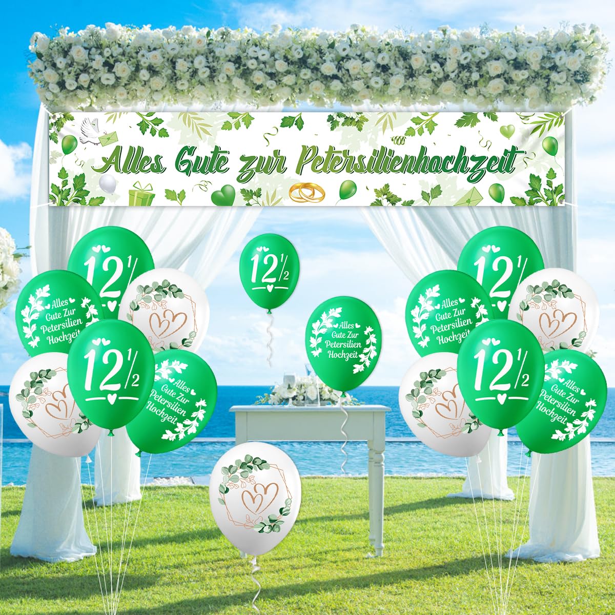 Alles Gute zur Petersilienhochzeit! Dieses komplett Deko-Set macht die Feier zu 12,5 Jahren Ehe unvergesslich. Enthalten ist alles, was du für die perfekte Jubiläumsfeier brauchst: Ein großes Banner (270x40cm) mit dem Spruch '12,5 Jahre - wie Petersilie in der Suppe: unscheinbar, aber unverzichtbar', 12 bunte Latexballons und einen charmanten Torten-Topper. Das Banner aus weichem Polyester ist farbecht, reißfest und kann immer wieder verwendet werden. Die Ballons sind ungiftig und geruchsneutral - einfach aufblasen und die Party kann beginnen! Alles ist blitzschnell aufgebaut: Banner aufhängen, Ballons füllen, Topper auf die Torte - und schon ist die Überraschungsparty fertig. Perfekt für drinnen und draußen, ob in der Küche, im Garten oder im Partykeller. Ein ideales Mitbringsel oder Geschenk für das Ehepaar - praktisch, dekorativ und voller Tradition. Mach die Petersilienhochzeit zu einem unvergesslichen Erlebnis!