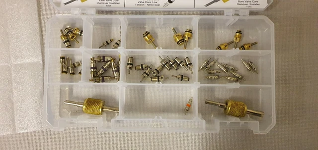 Im Set enthalten:• Hoch- und Niederdruck-Ventilkerne• Spezieller Ventilentferner• Dichtungen und Adapter• Für R12 und R134a Systeme