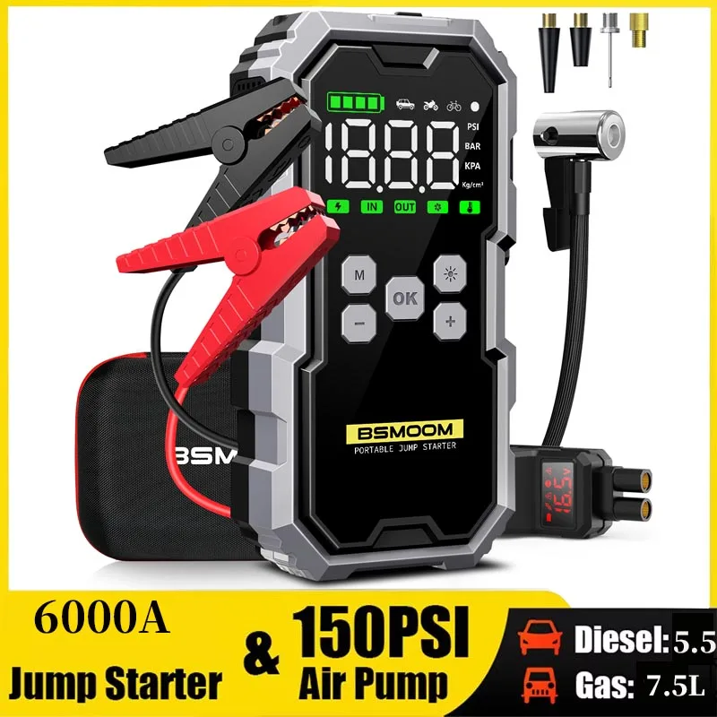 Der ultimative Retter in der Not für dein Auto! Diese vielseitige Starthilfe Powerbank mit 6000A Spitzenstrom startet auch bei kaltem Wetter zuverlässig 12V Fahrzeuge bis 9L Benzin oder 8L Diesel. Aber das ist noch nicht alles: Integriert ist ein kabelloser Kompressor mit bis zu 150 PSI für Reifen, Bälle und anderes Spielzeug. Die 400 Lumen LED-Taschenlampe mit drei Modi (Dauerlicht, Stroboskop, SOS) hilft bei nächtlichen Pannen. Mit einem riesigen 26800mAh Akku kannst du auch Smartphones und Tablets laden - inklusive QC3.0 Schnellladung! Das LCD-Display zeigt dir alle wichtigen Informationen auf einen Blick. 10-facher Schutz vor Kurzschluss, Überhitzung und anderen Gefahren sorgt für maximale Sicherheit. Leicht und tragbar - der perfekte Begleiter für jede Autofahrt, Camping-Trip oder Outdoor-Abenteuer!