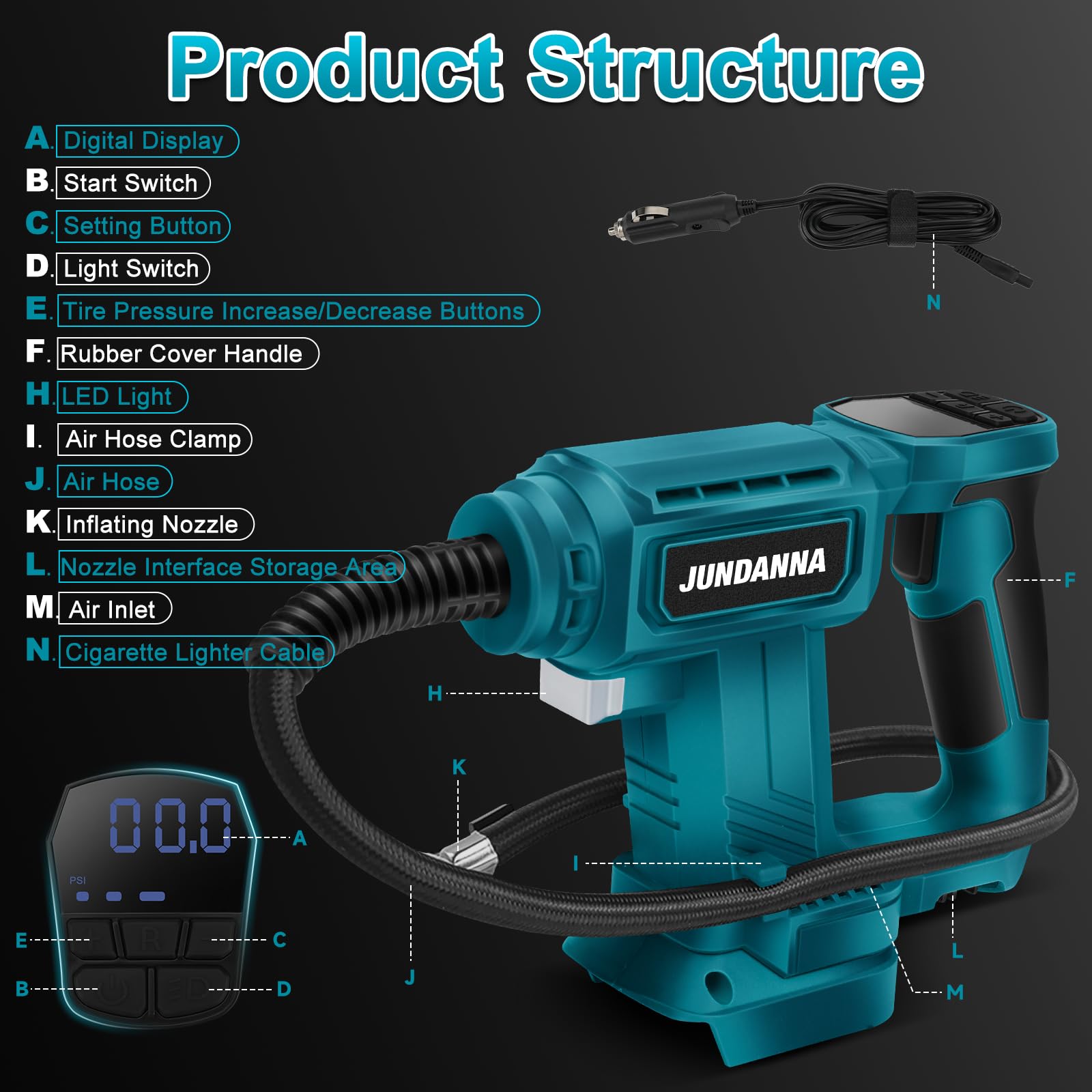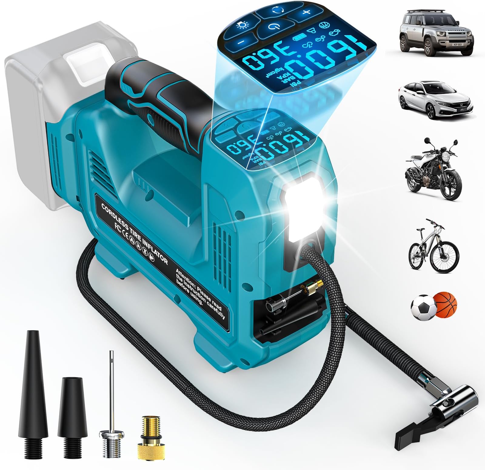 Praktischer Akku-Kompressor für unterwegs! Kompatibel mit Makita 18V Akkus (BL1820, BL1830 etc.) - Akku nicht im Lieferumfang. Bis zu 120 PSI Maximaldruck - für Autos, Motorräder, Fahrräder und Bälle. Schnelles Aufpumpen: Auto-Reifen 0-35 PSI in 5-6 Minuten, Fahrrad in 1-2 Minuten. Digitales Manometer mit 4 Einheiten: PSI, KPA, BAR, KG/cm². Mit LED-Beleuchtung für Nacht-Einsätze. Automatische Abschaltung bei Erreichen des Soll-Drucks - kein Überpumpen. Inklusive verschiedener Adapter für alle Anwendungen. Perfekt für Reisen, Camping oder die Garage. Einfach Akku drauf und lospumpen - mehr Komfort geht nicht!