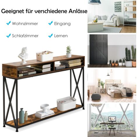 Dieser elegante Konsolentisch bringt Ordnung und Style in dein Zuhause! Mit 100x28x75cm perfekt für Flur, Wohnzimmer oder als Sofatisch. Der stabile Metallrahmen mit X-Verstrebungen und verstellbaren Beinen sorgt für Standfestigkeit. Aus feuchtigkeitsbeständigem Holzwerkstoff - super leicht zu reinigen. Und das Beste: Mega viel Stauraum für Zeitschriften, Bücher und Deko. Einfach zusammenzubauen und sofort einsatzbereit. Ein echter Hingucker für jedes Zuhause!