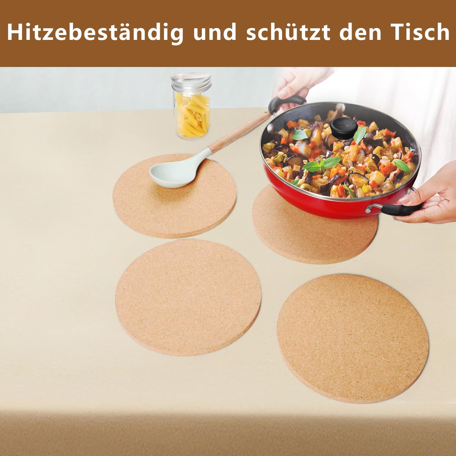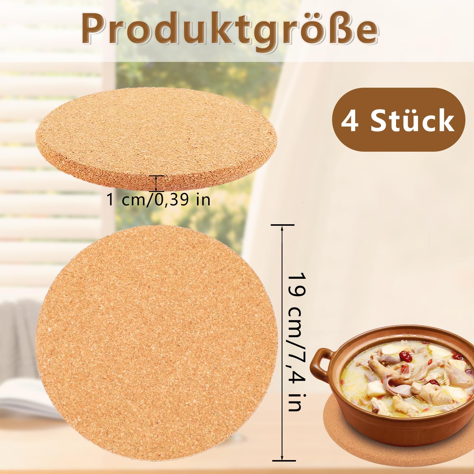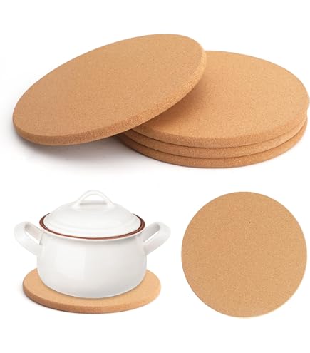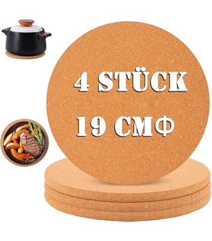 Hey, diese Kork-Untersetzer sind echt praktisch! Das Set hat vier stabile Untersetzer aus natürlichem Kork, jeder 19 cm groß. Die schützen deine Tischplatte vor hässlichen Hitze- und Kratzspuren, wenn du heiße Töpfe, Pfannen oder Tassen abstellen willst. Das Beste: Die Dinger sind richtig rutschfest! Dein Topf verrutscht nicht mehr und macht auch weniger Krach beim Abstellen. Die Kork-Untersetzer sind super flexibel aber trotzdem stabil - die verziehen sich nicht und halten ewig. Du kannst sie nicht nur in der Küche verwenden, sondern auch unter Seifenspendern, Kerzen oder Pflanzen im Wohnzimmer stellen. Sie sind saugfähig und halten deine Möbel sauber und trocken. Perfekt für Küche, Esszimmer oder Wohnbereich. Und wenn du kreativ bist, eignen sie sich sogar für Bastelprojekte! Einfach ein vielseitiges Must-Have für jeden Haushalt, das deine Möbel schützt und dabei noch gut aussieht.