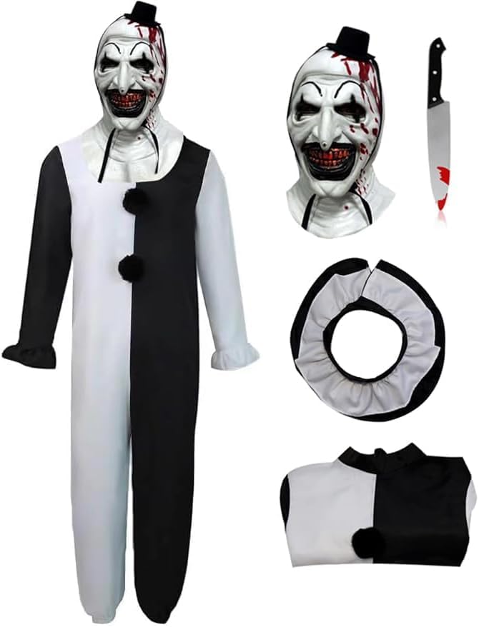 Achtung, gruselig! Dieses Horror-Clown-Kostüm verwandelt dein Kind in den fiesen Art the Clown aus dem Film Terrifier. Im Set enthalten: schwarz-weißer Overall mit Blutflecken, eine gruselige Maske mit bösem Grinsen und ein täuschend echtes Spielzeugmesser. Ideal für Halloween, Karneval oder Mottopartys. Das Kostüm besteht aus atmungsaktivem Polyester, ist weich auf der Haut und hält auch wildeste Tanzpartys aus. Die Maske bietet gute Sicht und kann lange getragen werden. Dein Kind wird zum Star jeder Party – und sorgt für Gänsehaut bei allen Gästen! Einfach anziehen und losgruseln. Aber Vorsicht: Nicht zu erschreckend sein!