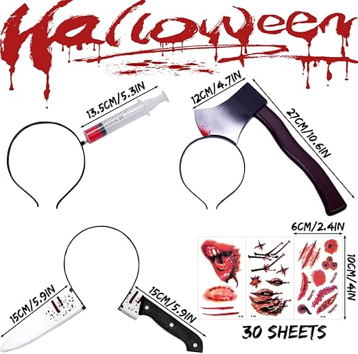 Für den ultimativen Gruselfaktor auf der Halloween-Party! Dieses Set mit drei gruseligen Haaraccessoires bringt jeden zum Schreien. Enthalten sind: Messer-im-Kopf-Band, Schere-im-Kopf-Band und Spritze-im-Kopf-Band - alle mit blutigen Details für den extra-schaurigen Effekt. Aus hochwertigem Kunststoff, geruchsneutral und absolut sicher zu tragen. Die realistischen Designs sehen aus wie echt - perfekt für Vampir-Partys, Zombie-Events oder Horror-Mottos. Aber die Bänder können nicht nur gruseln: Sie halten auch super deine Haare in Form und passen sich jeder Kopfgröße an. Egal ob Kind oder Erwachsener - sie sitzen bequem und können lange getragen werden. Kombinier sie mit deinem Kostüm für den vollendeten Grusel-Look. Perfekt für Schulfeiern, Firmenevents, Geburtstagspartys oder einfach um deine Freunde zu erschrecken. Mit diesen Accessoires wirst du definitiv zum Highlight jeder Party!