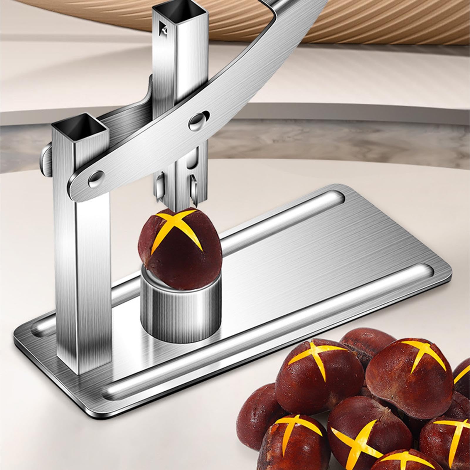 Endlich knackst du Nüsse und Kastanien mühelos! Dieser Kastanienschneider aus lebensmittelechtem 304er Edelstahl ist rostfrei, korrosionsbeständig und damit perfekt für den häufigen Gebrauch. Die scharfe Kreuzklinge durchtrennt selbst harte Schalen, ohne das Innere der Nüsse zu beschädigen. Dank des ergonomischen Griffs mit rutschfester Oberfläche liegt das Teil super in der Hand – auch für Kinder geeignet. Mit dem cleveren Hebeldesign und der integrierten Feder geht das Öffnen von Kastanien, Walnüssen oder Haselnüssen super einfach und schnell. Einfach reinigen, platzsparend verstauen und immer griffbereit haben. Perfekt für die heimische Küche, Bäckereien oder Restaurants – ein echter Helfer für alle Nuss-Fans!