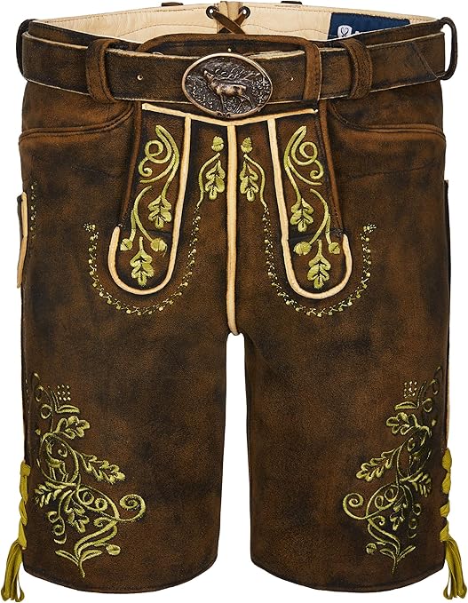 Servus! Diese Hirschberger Lederhose 'Krokus' ist echte Traditionsqualität! Aus superweichem Glattleder mit Vintage-Look - sieht aus wie ein Erbstück! Jede Hose ein Unikat mit individueller Musterung. Traditionelle Stickerei an Hosenträger, Latz und Beinen - dezent und stylisch. Knöpfe in Hirschhornoptik - authentisches Detail. Weitenregulierung durch 'Brotzeitkante' und variable Hosenträger - passt immer! 2 Vordertaschen, Gesäßtasche und Messertasche am rechten Bein - praktisch! Von Größe 44 (82-86cm Bund) bis 60 (116-120cm Bund) - für jede Figur. Fällt etwas enger aus - am besten eine gut sitzende Hose zum Vergleich nehmen. Perfekt für Oktoberfest, Hochzeiten, Feste - immer ein Hingucker! Echte Markenqualität aus Deutschland - spürt man sofort! Tradition die begeistert!