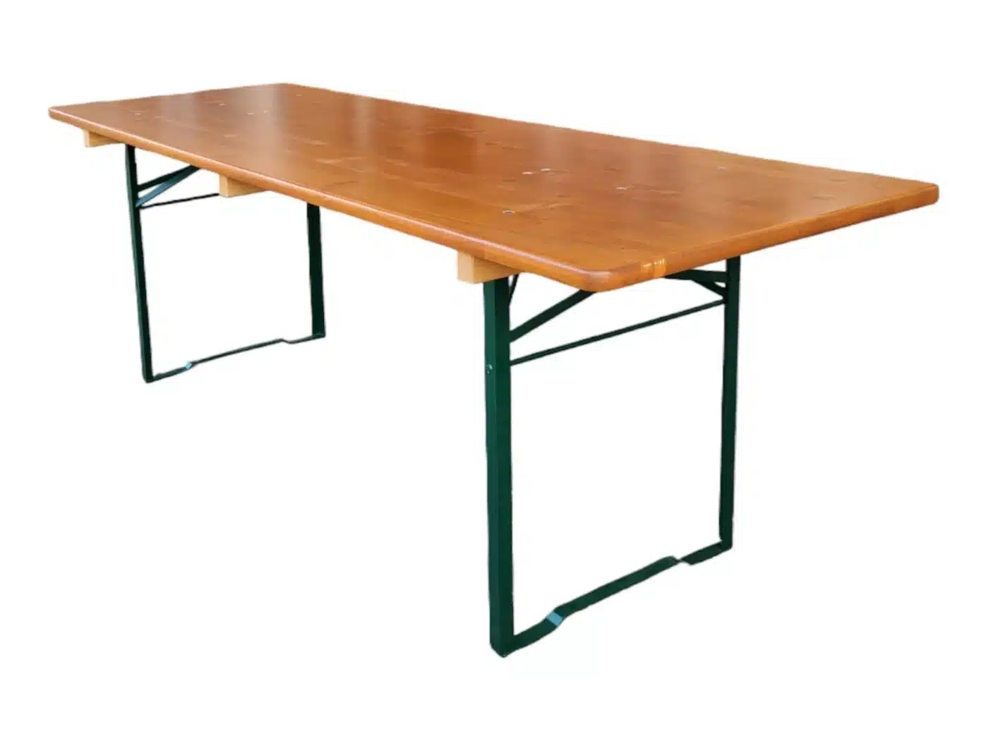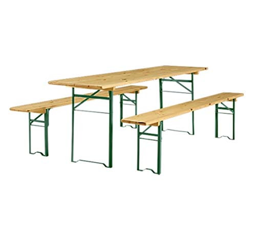Echte Brauereiqualität für deinen Garten! Diese Bierzeltgarnitur besteht aus einem 220cm langen Tisch (50cm breit) und zwei Bänken (je 220x27cm). Aus massivem Fichtenholz, doppelt lackiert in schönem Ocker - das hält auch bei Wind und Wetter stand. Die Untergestelle aus pulverbeschichteten Winkeleisen sind dunkelgrün und super stabil, mit Diagonalkreuz für extra Festigkeit. Keine klapprige Baumarktware hier - das ist Profi-Qualität direkt vom Hersteller! Perfekt für Gartenfeste, Geburtstage oder einfach gemütliche Abende im Freien. Klappt praktisch zusammen und lässt sich platzsparend verstauen. Damit wird dein Garten zum echten Biergarten - Prost!