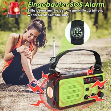 Nie wieder ohne Strom! Dieses robuste Solar-Notfallradio ist dein perfekter Begleiter für Outdoor-Abenteuer, Camping oder den Notfall zu Hause. Mit vier verschiedenen Stromquellen bist du immer abgesichert: Solarladung bei Sonne, Handkurbel für Notfälle, der riesige 20000-mAh-Akku und USB-C-Ladung. Der Akku hat so viel Power, dass du sogar dein Handy laden kannst!