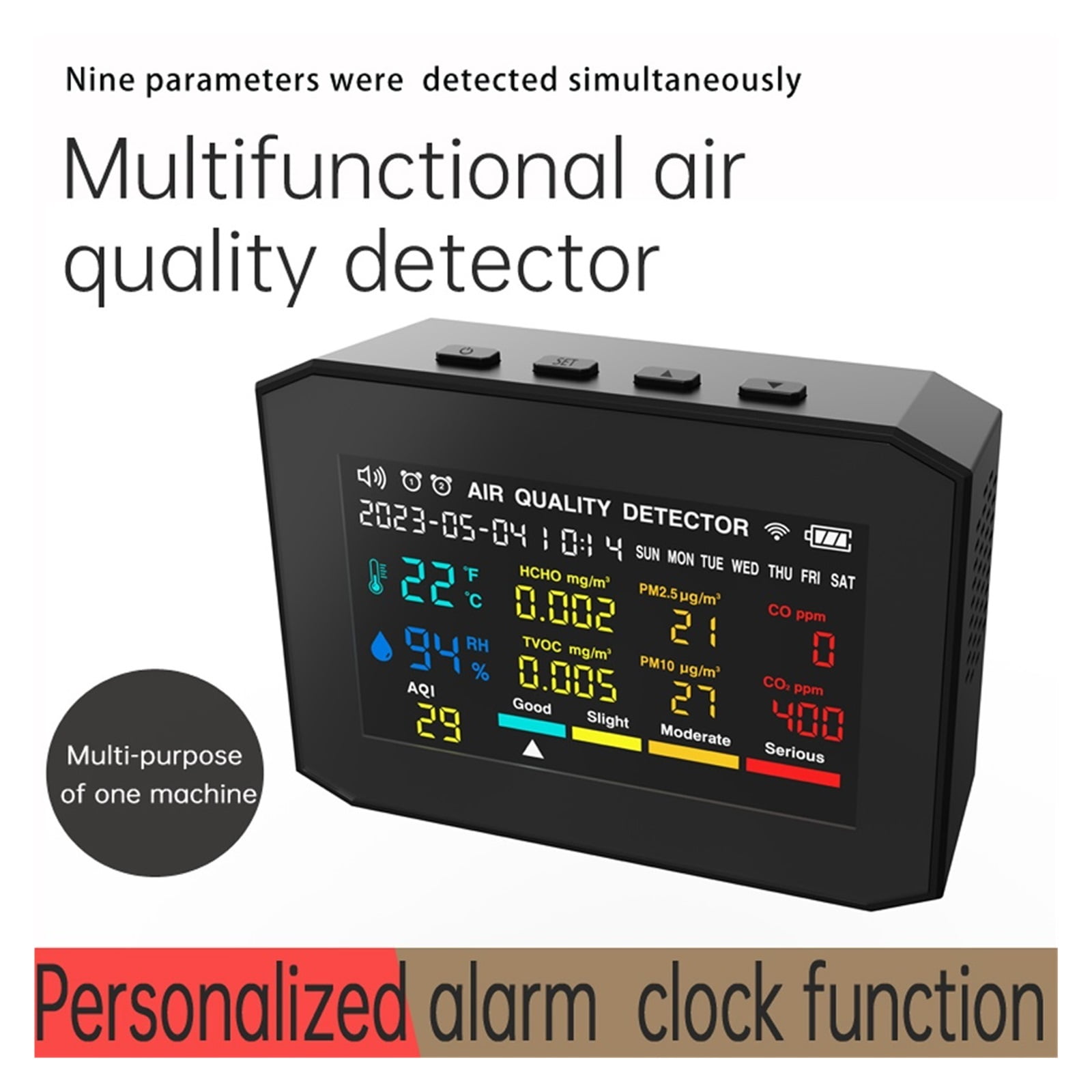 Kennst du die Luftqualität in deinen Räumen? Mit diesem cleveren CO2-Detektor schon! Das LCD Display zeigt dir alles Wichtige auf einen Blick: CO2-Wert, Temperatur, Luftfeuchtigkeit und sogar Schadstoffe wie TVOC und HCHO. Super praktisch fürs Homeoffice, Klassenzimmer oder Wohnzimmer. Misst super genau von 400-5000 ppm CO2 und funktiert mit nem kräftigen 1200 mAh Akku. Das coole Design passt auf jeden Tisch oder lässt sich an der Wand befestigen. Besonders clever: Die Helligkeit vom Display lässt sich anpassen - perfekt für nachts! Ob im Gewächshaus, Labor oder daheim - du weißt immer, was du atmest. Inklusive Ladekabel und Handbuch. Ein Must-Have für alle, die auf gesunde Raumluft achten!