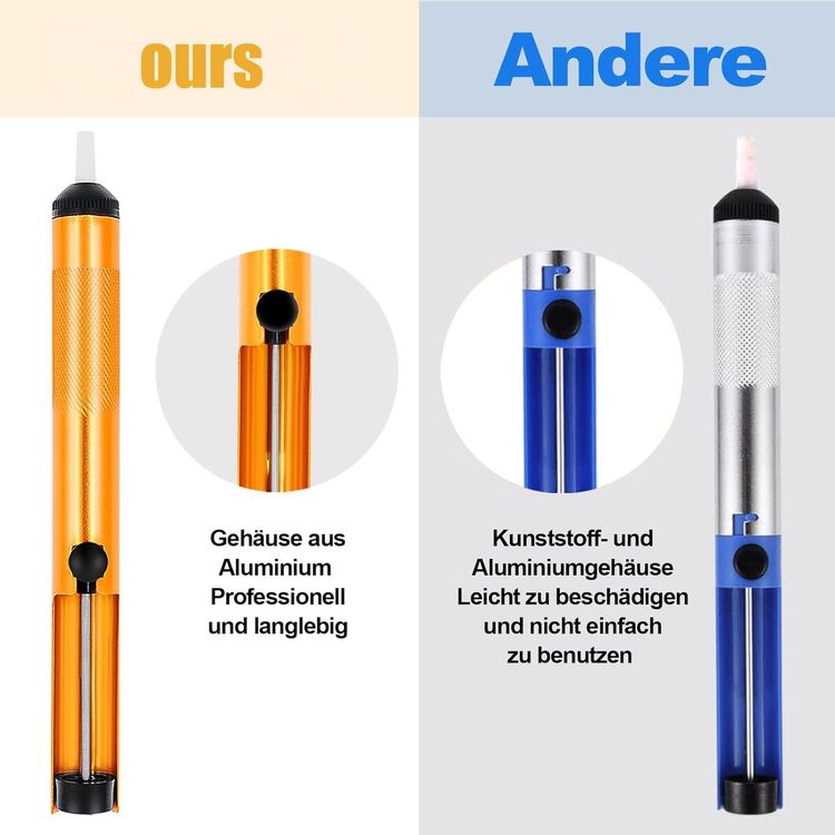 Im Set findest du nicht nur den Lötkolben mit 5 verschiedenen Spitzen, sondern auch praktisches Zubehör wie Entlötpumpe, Pinzette, Abisolierzange, Lötzinn und einen stabilen Ständer mit Reinigungsschwamm. Alles verpackt in einer praktischen Tasche, sodass du dein Equipment immer ordentlich verstauen kannst.