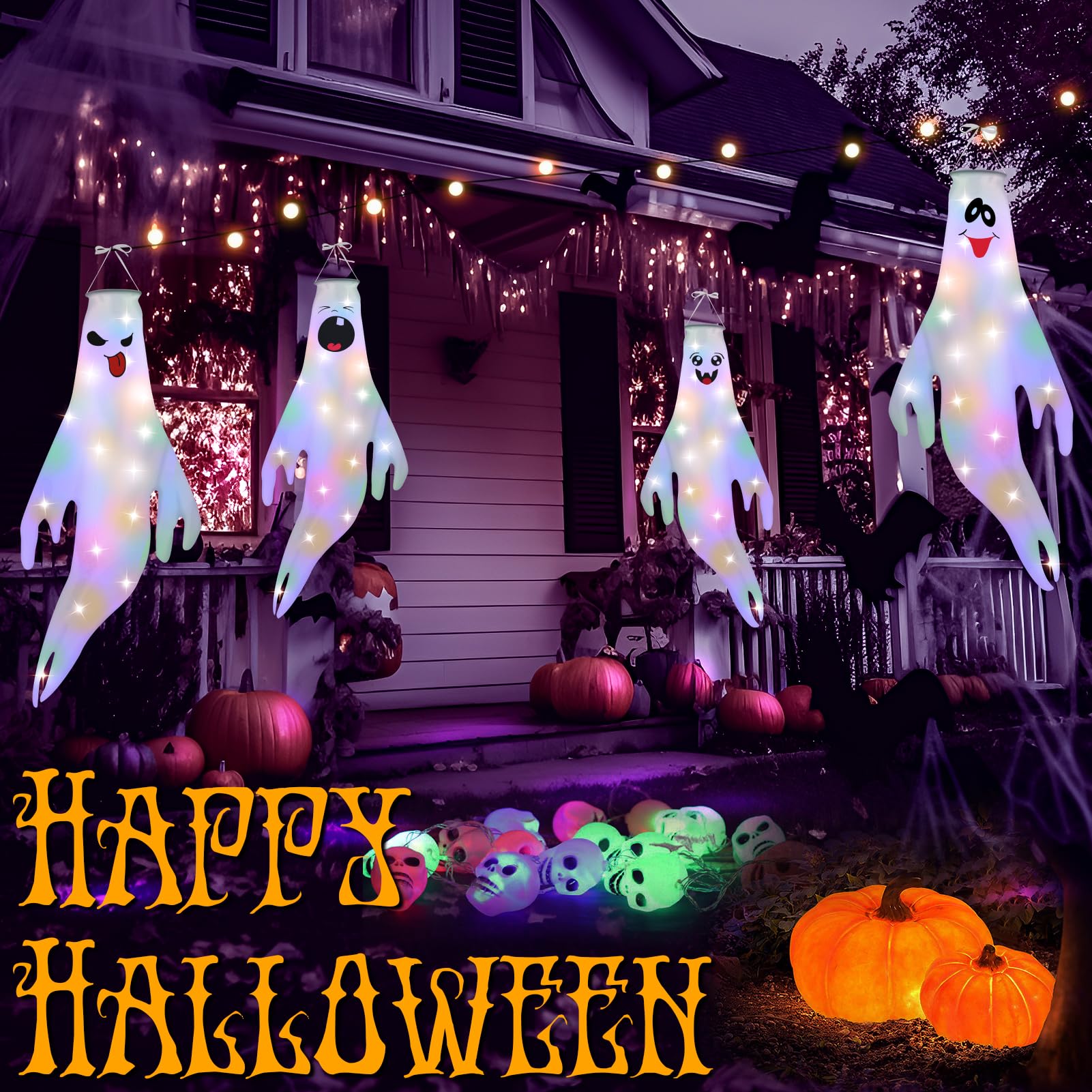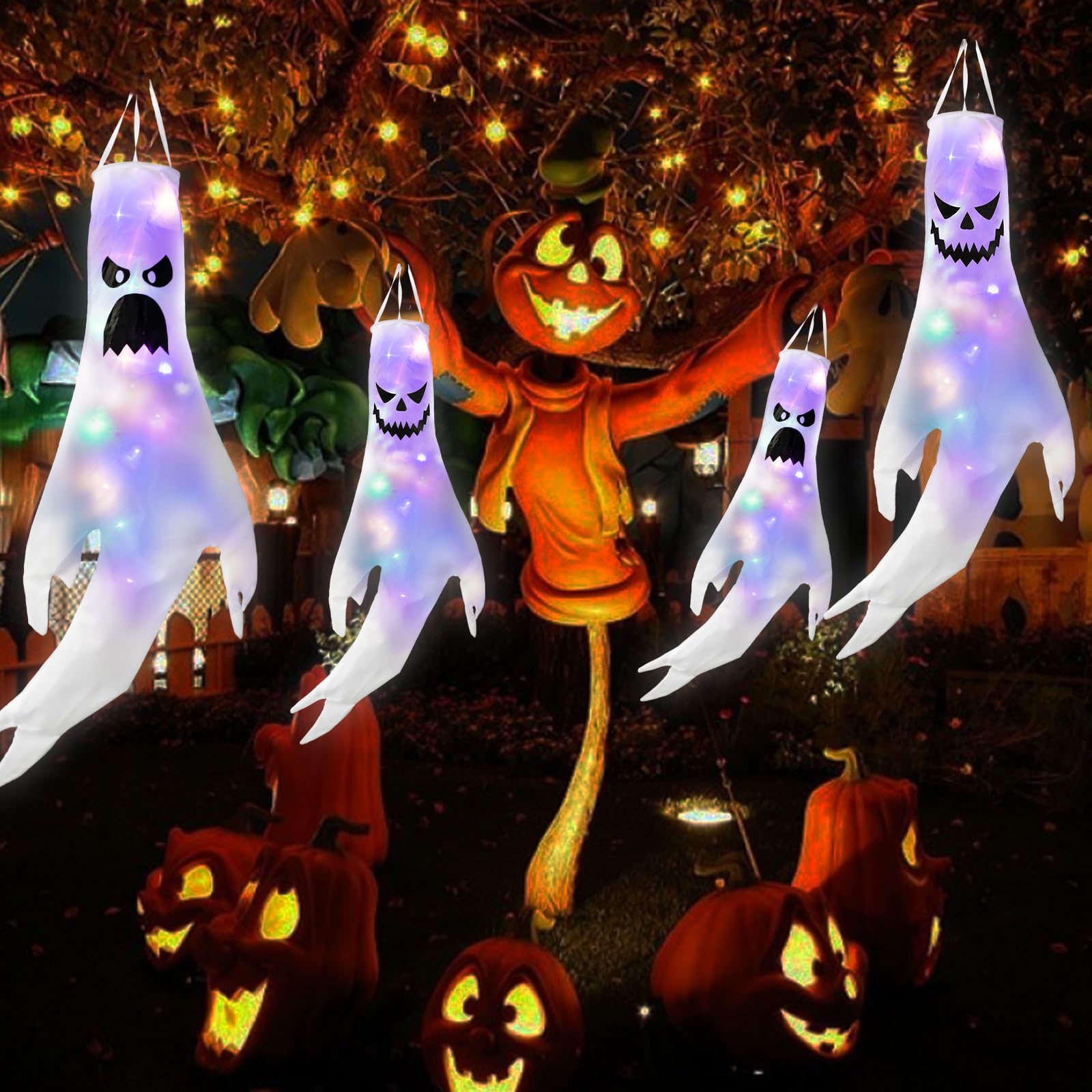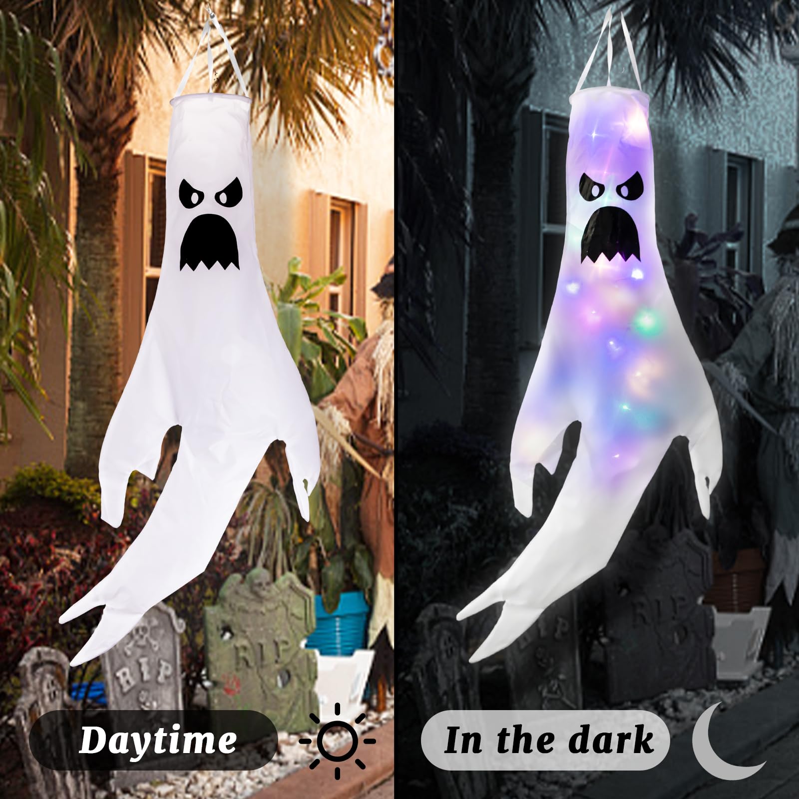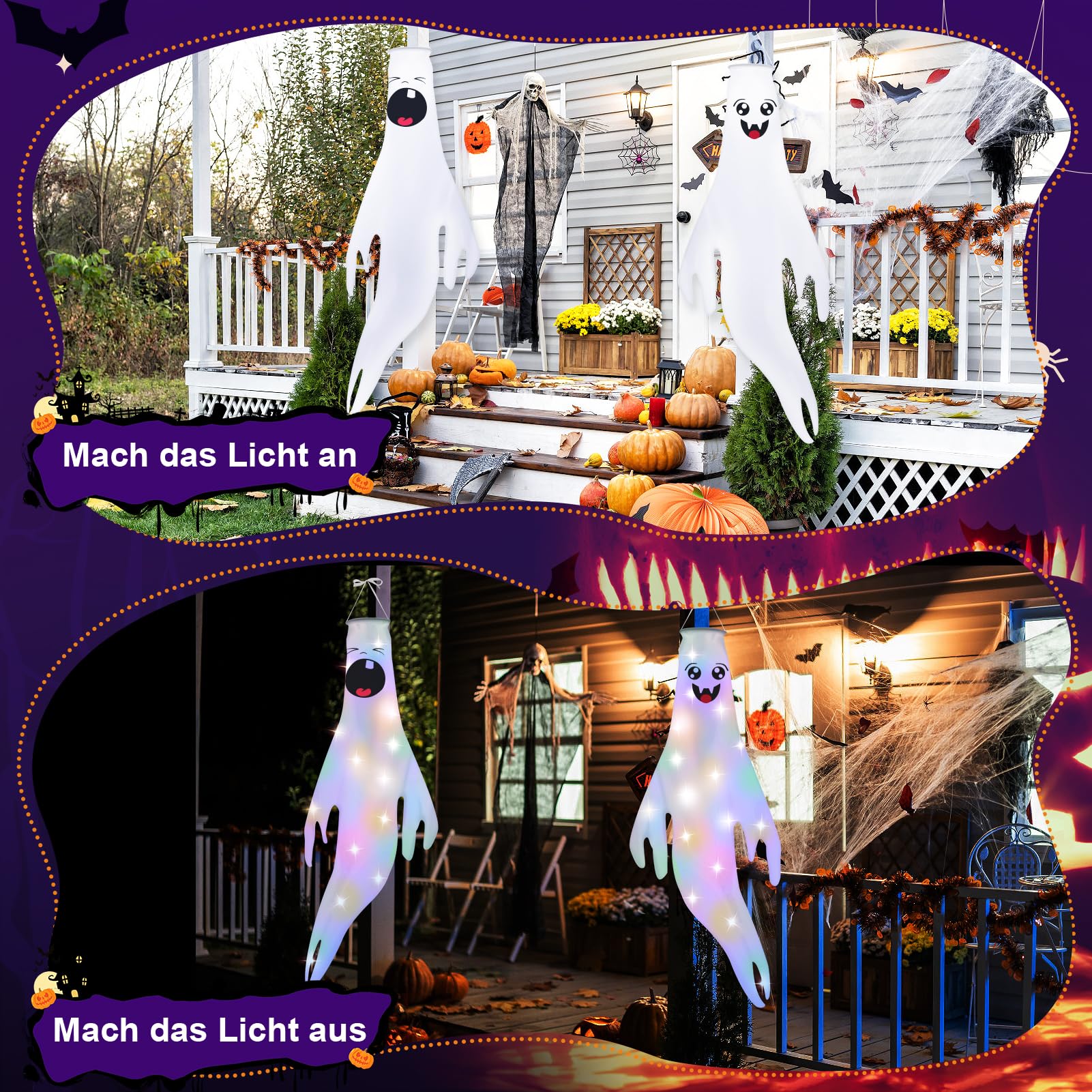 Halloween-Fans, diese gruseligen Geister-Windsäcke machen jede Party zum Event! Im 2er-Set mit je 46cm Größe schweben sie gruselig im Wind wenn's draußen stürmt. Mit integrierten LED-Lichtern leuchten sie nachts richtig unheimlich - perfekt für die Grusel-Stimmung! Aus wetterfestem Polyester gefertigt, halten sie auch mal einen Regenschauer aus. Jeder Geist hat einen Metallhaken und Aufhängeseil - einfach an Bäume, Türen oder die Veranda hängen. Ob für die Halloween-Party, Gruselhaus-Dekoration oder einfach nur um die Nachbarn zu erschrecken - diese Geister sind immer dabei! Die weißen Gespenster sehen echt creepy aus wenn sie im Wind tanzen. Einfach aufhängen, LEDs einschalten und schon ist die Grusel-Atmosphäre perfekt! Auch als Geschenk für Halloween-Liebhaber super geeignet. Macht euer Zuhause zur gruseligsten Adresse der Straße!
