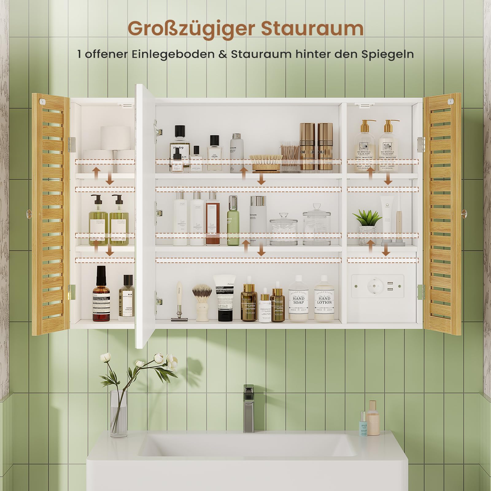 Einfach den berührungsempfindlichen Schalter antippen und schon hast du perfektes Licht! Der HD-Spiegel zeigt jedes Detail und macht dein Bad optisch größer. Hinter den zwei Spiegeltüren verstecken sich praktische Fächer, und die Ablagen sind 3-fach verstellbar - so passt alles rein, egal ob große Flaschen oder kleine Tuben.