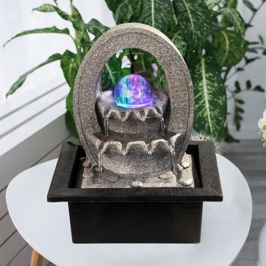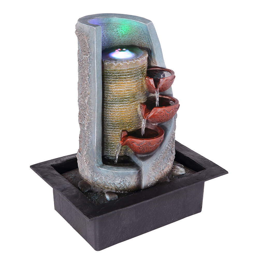 Entspannung pur mit diesem wunderschönen Zimmerbrunnen! Das Terrasse-Design in 19,5x19,5x20,5cm bringt Natur-Feeling ins Wohnzimmer oder Büro. Mit farbwechselnder LED-Beleuchtung die für magische Stimmung sorgt. Die 3W Pumpe ist regulierbar - du bestimmst wie stark das Wasser plätschert. Funktioniert mit 230V/12V inklusive Netzteil - einfach einstecken und genießen. Aus Kunststoff und Polyresin in Steinoptik - sieht aus wie echt! Wirkt als sanfter Luftbefeuchter durch die Verdunstung. Schafft eine beruhigende Atmosphäre und verbessert das Raumklima. Perfekt zum Abschalten nach einem stressigen Tag. Ein tolles Geschenk für alle die Entspannung lieben. Einfach aufstellen, anschalten und in die Welt des plätschernden Wassers eintauchen!