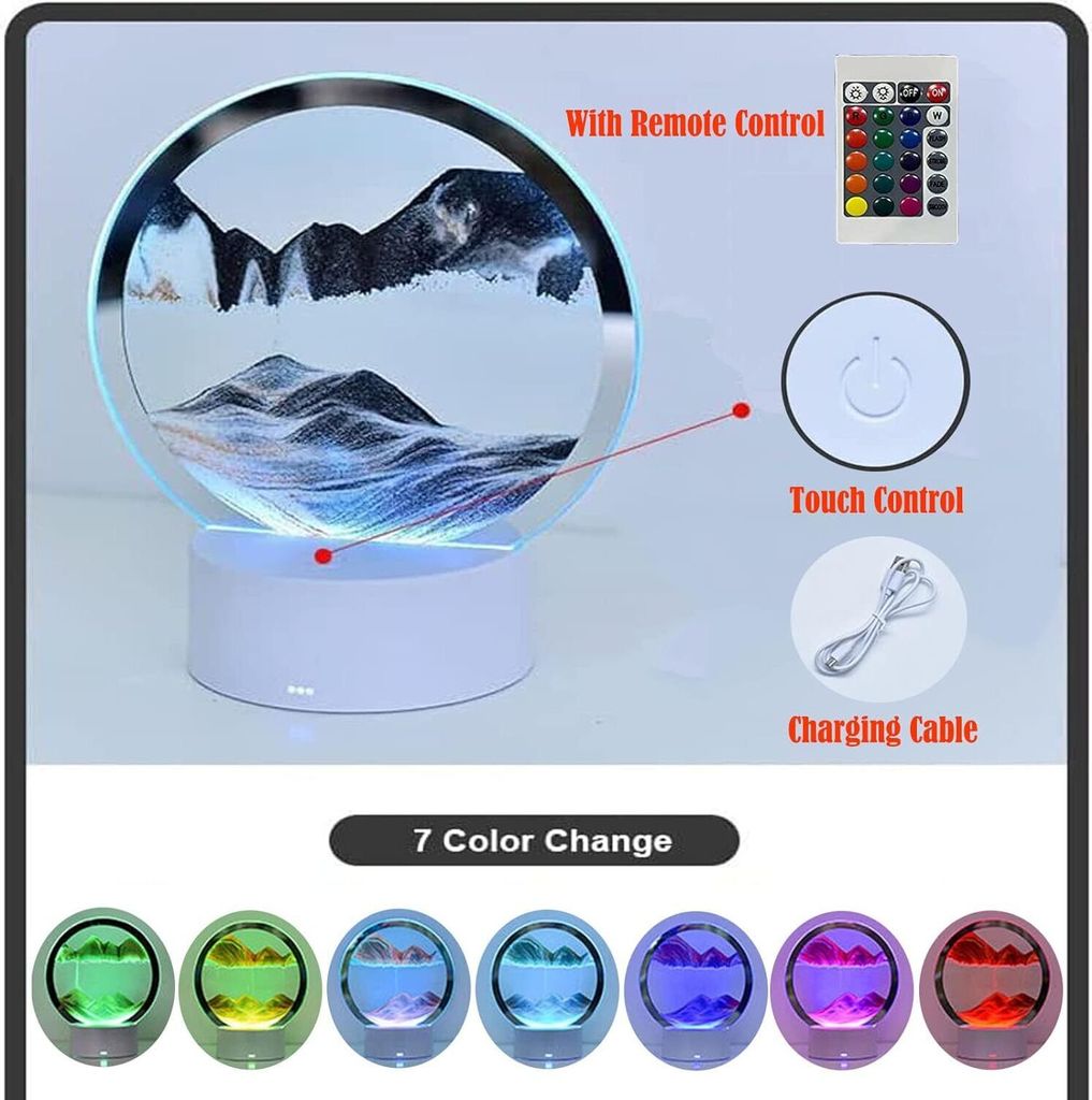Einfach faszinierend! Dieses 3D Sandbild erzeugt bei jeder Drehung ein neues, einzigartiges Kunstwerk. Der farbige Sand formt langsam Wüsten, Ozeane und Berge - jedes Mal anders! Mit 7 LED-Beleuchtungsmodi in verschiedenen Farben, die per Touch-Schalter eingestellt werden können. Die 16x18,5cm große Lampe kann um 360° gedreht werden und ist sowohl per USB als auch mit Batterien betreibbar. Perfekt zur Entspannung - einfach zuschauen wie der Sand langsam rieselt und den Stress des Tages vergessen. Aus bleifreiem Glas mit hoher Transparenz, damit du die Sandkunst optimal genießen kannst. Super als Deko fürs Wohnzimmer, Büro oder als Geschenk. Einfach den Sand nach unten rieseln lassen, umdrehen und ein neues Kunstwerk entsteht! Einfach ein meditatives Erlebnis das nie langweilig wird - denn kein Sandbild gleicht dem anderen!